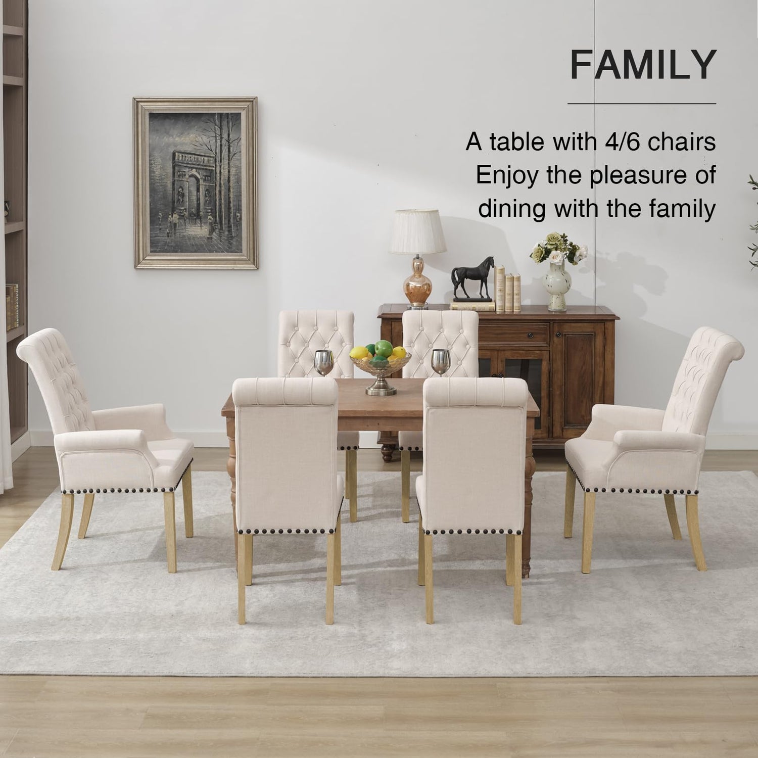 - STURDY AND DURABLE: The overall structure of this upholstered dining room chair features a solid wood frame. The fabric is durable linen that covers the backrest and seat cushions. It's very durable. Four solid wood legs support the entire dining room chair, Weight capacity: 300 lbs.