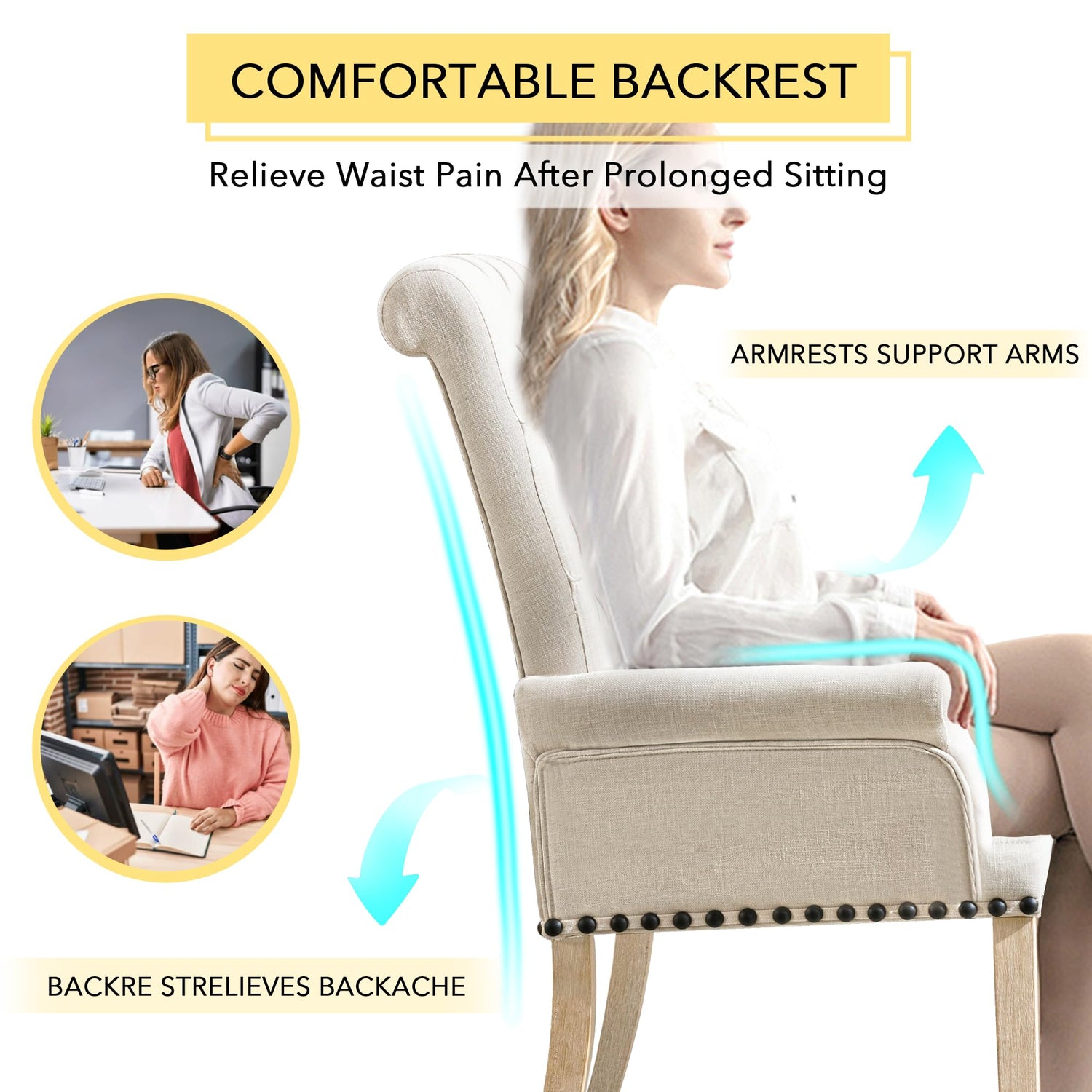 - BEAUTIFUL DESIGN: The slightly curved backrest of the bedroom chair features hand-stitched buttons, simple yet elegant. The armrests on both sides of the high back chair give the entire dining chair a noble look and can also support your arms to avoid fatigue from sitting for long periods of time.