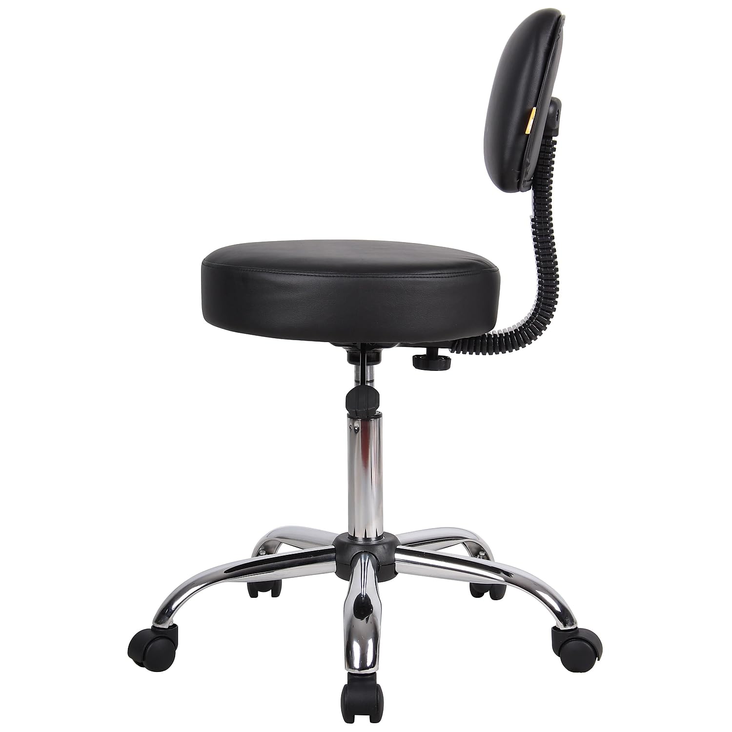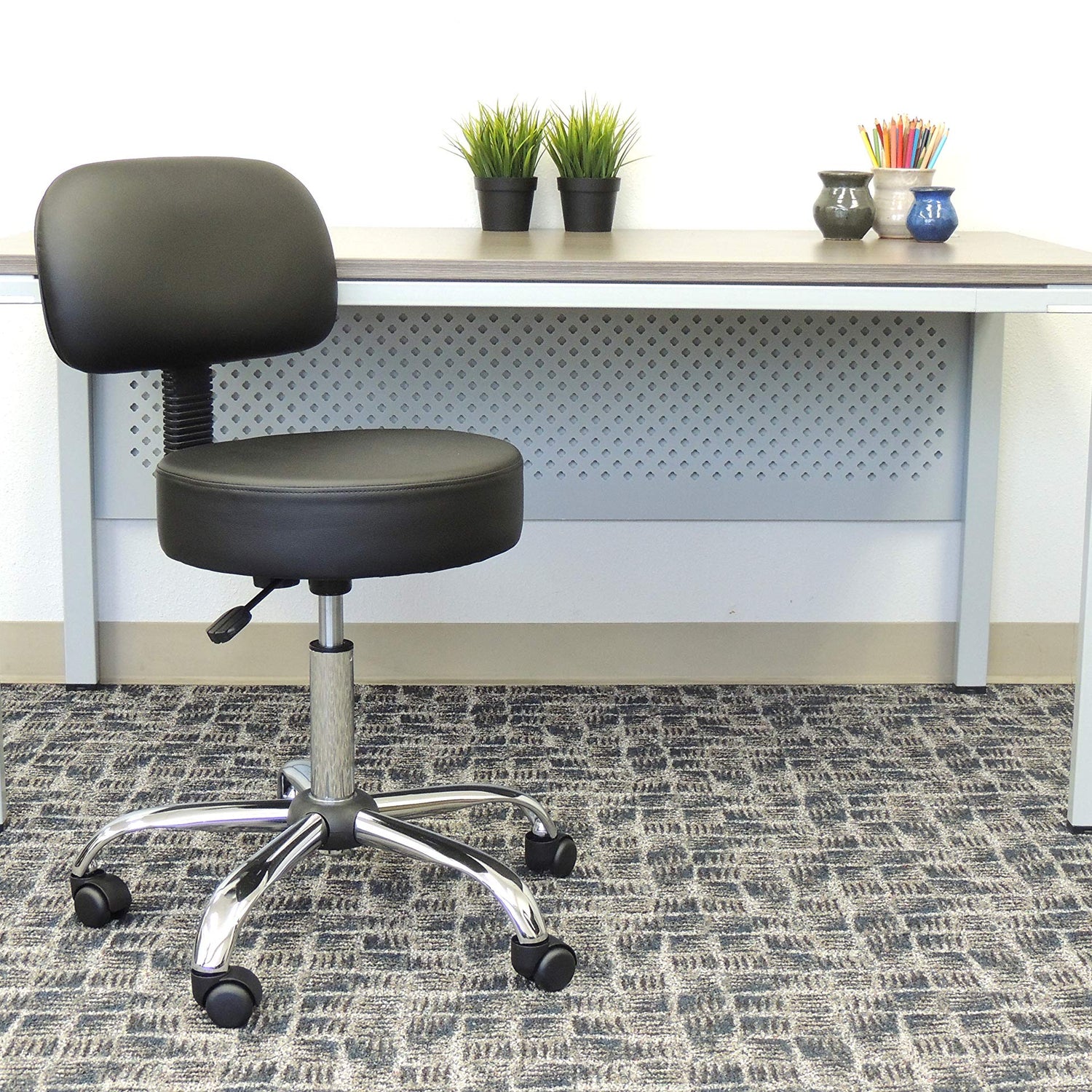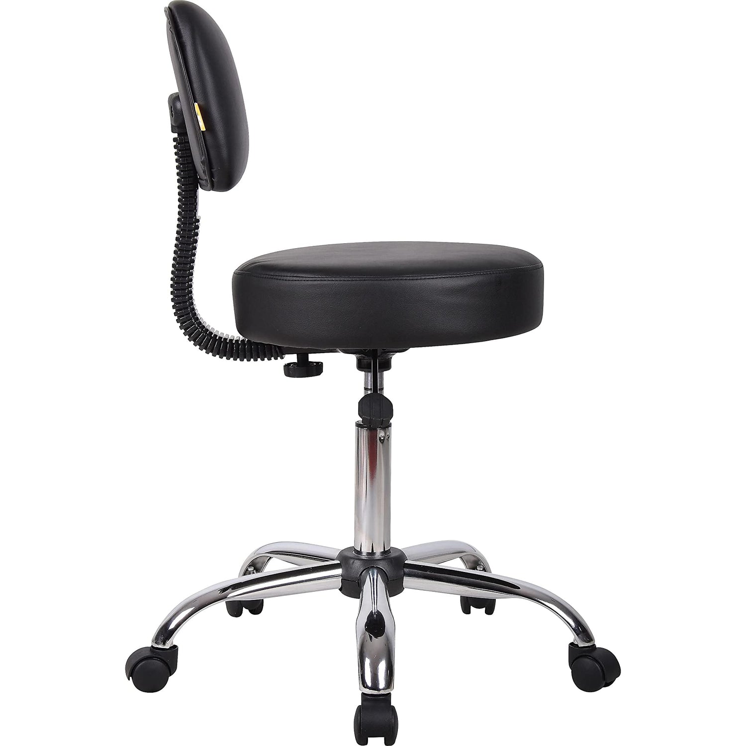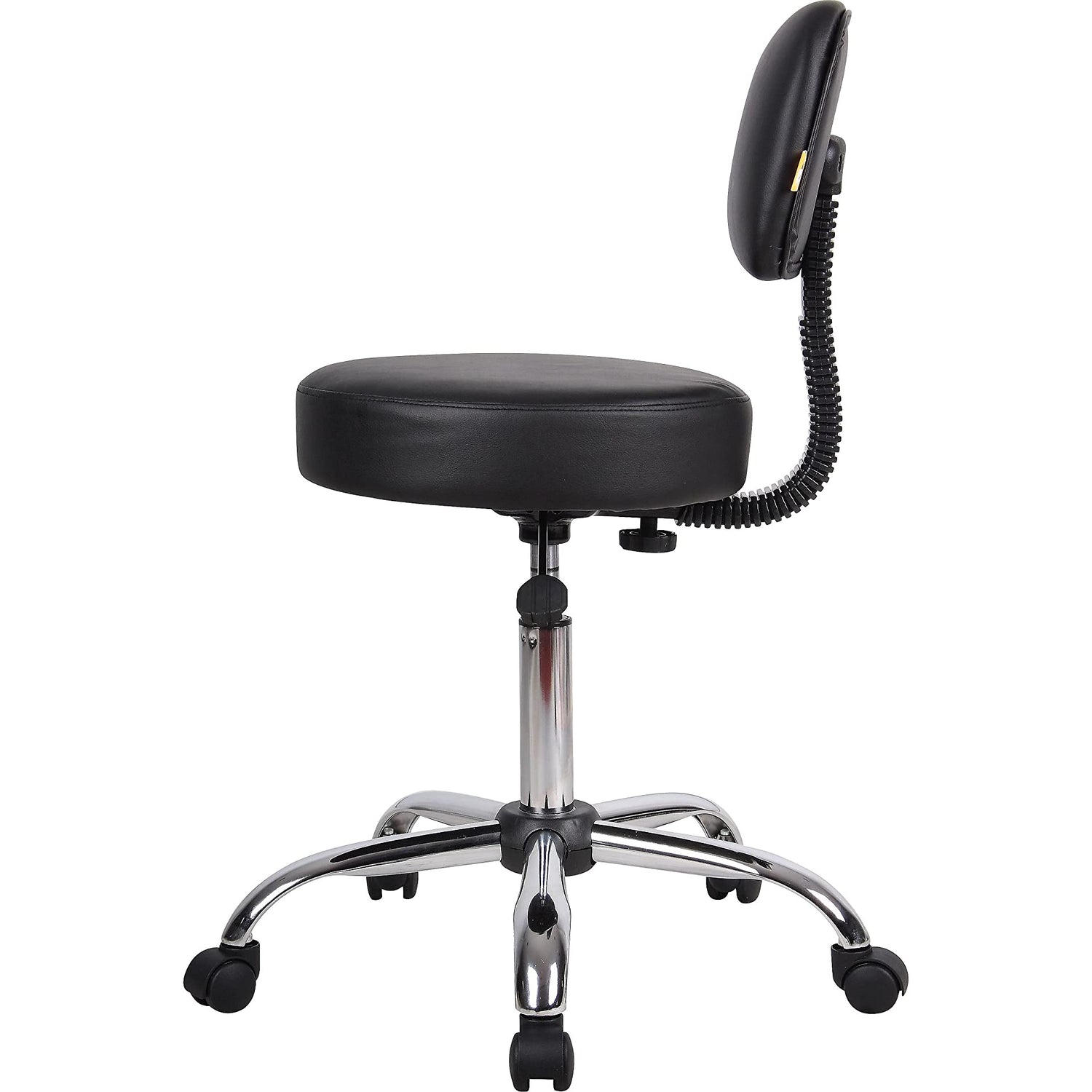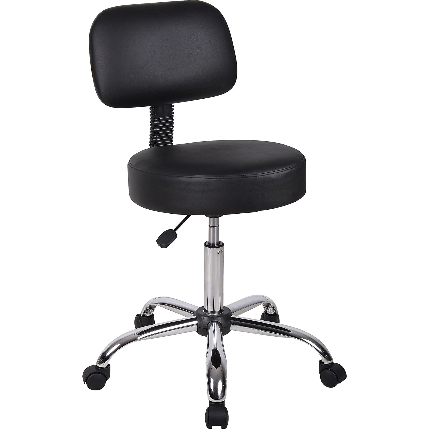 Details: Fashioned with dual wheel casters, the Boss Black Caressoft Medical Stool With Back Cushion easily moves from one area of the room to the other. Users appreciate the ergonomic design that works with the spine to reduce stress and improve comfort. The seat and back are made using Caressoft vinyl upholstery, which is not only attractive in appearance, but also easy to clean in between appointments. The height of the seat is adjustable with a 6" range using the pneumatic gas lift. In addition to this model with the back cushion, users can also purchase model B240 if no back cushion is required. No infinite lock