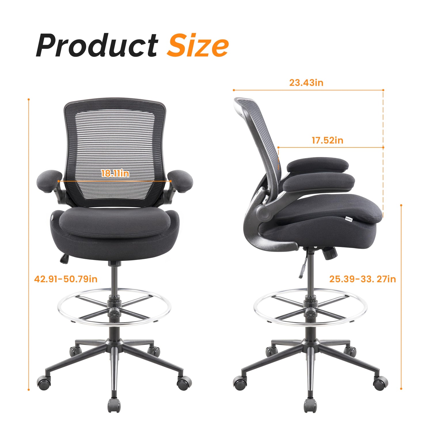• Wide Application& Product Size:The office drafting chair is not suitable for people who are too large. Chair height: 43.5 to 50.8 inches. Cushion height: 24.8 to 32.1 inches from the floor. Cushion front and back distance: 22.4 inches. Cushion width: 21.1 inches.This tall desk chair is suitable for many scenes and audiences, you can use this chair anywhere you need such as office, home, laboratory etc. It is also suitable for various people such as draftsman, designer, etc.