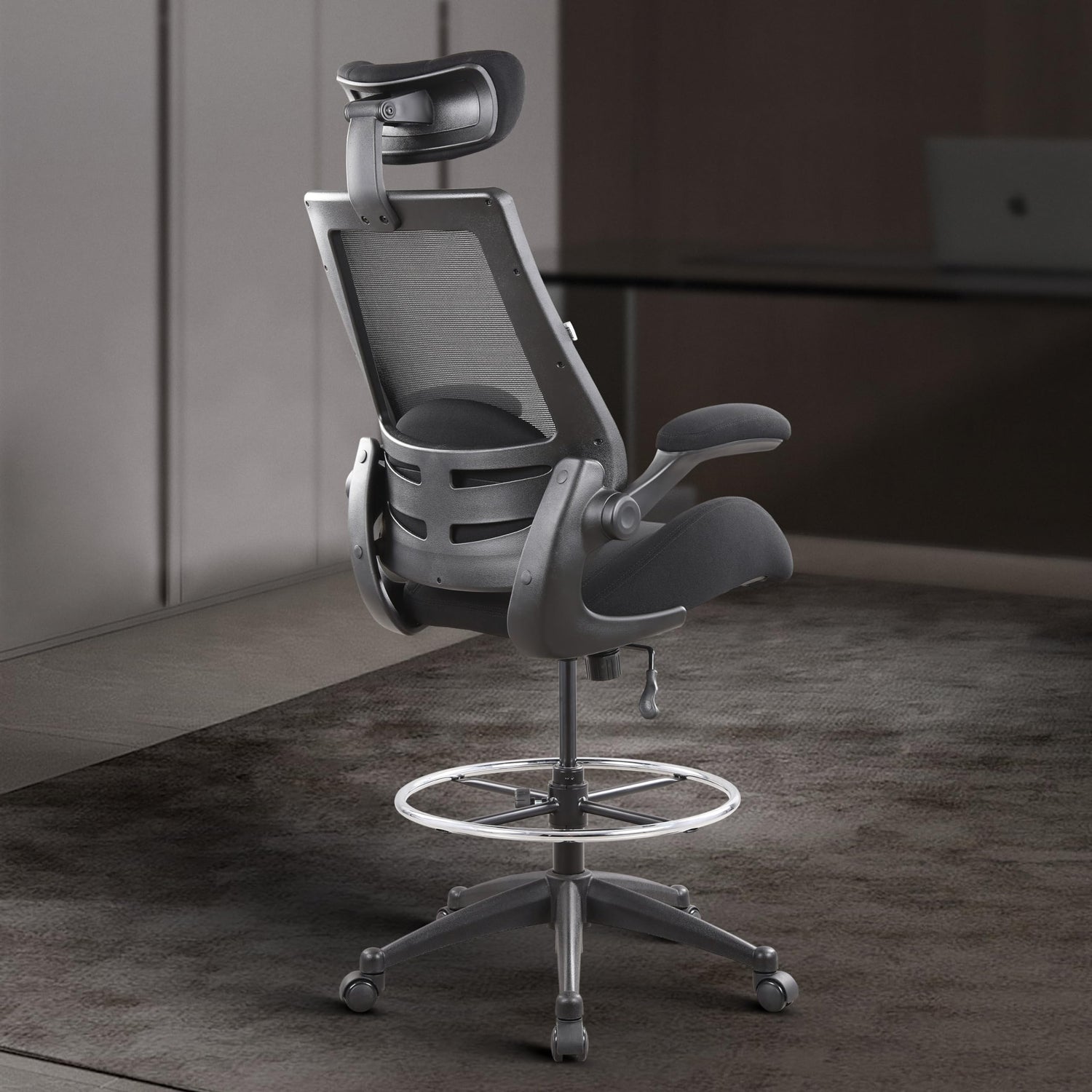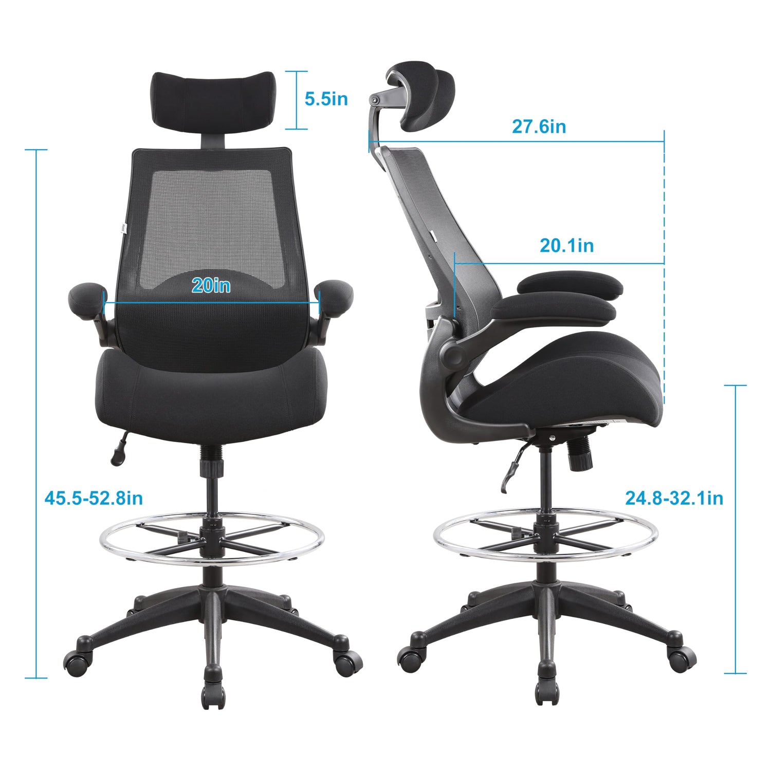 - Drafting Chair With Headrest: 3D designed headrest with height adjustable foot ring.The 90-degree flipped arms can save indoor space, suitable for stand-working,sit-working,bar,Café and so on.With a oversize foot ring helps you swivel 360 degree, reduce the pressure on the legs and increase the comfort of the back and buttocks.