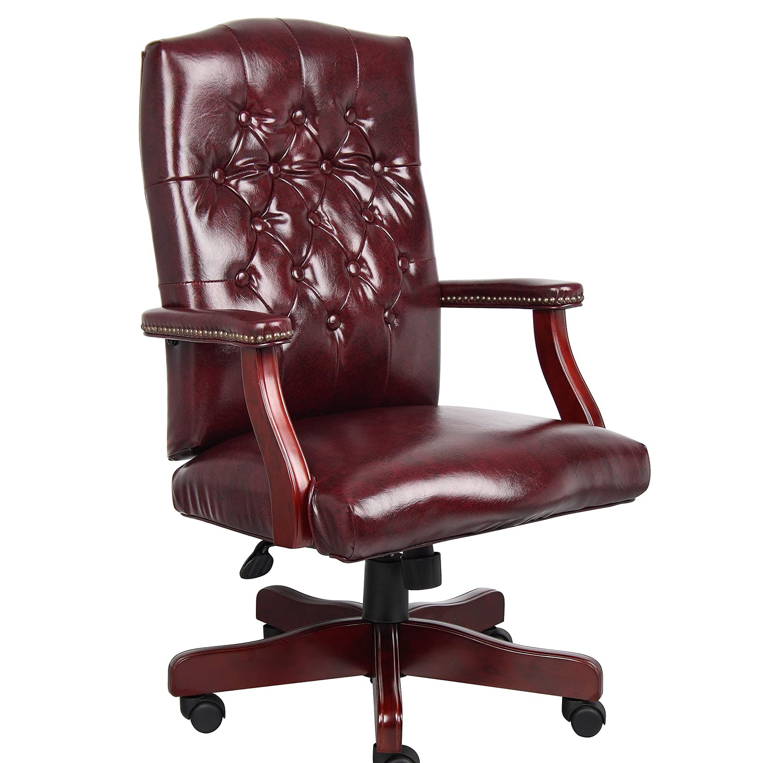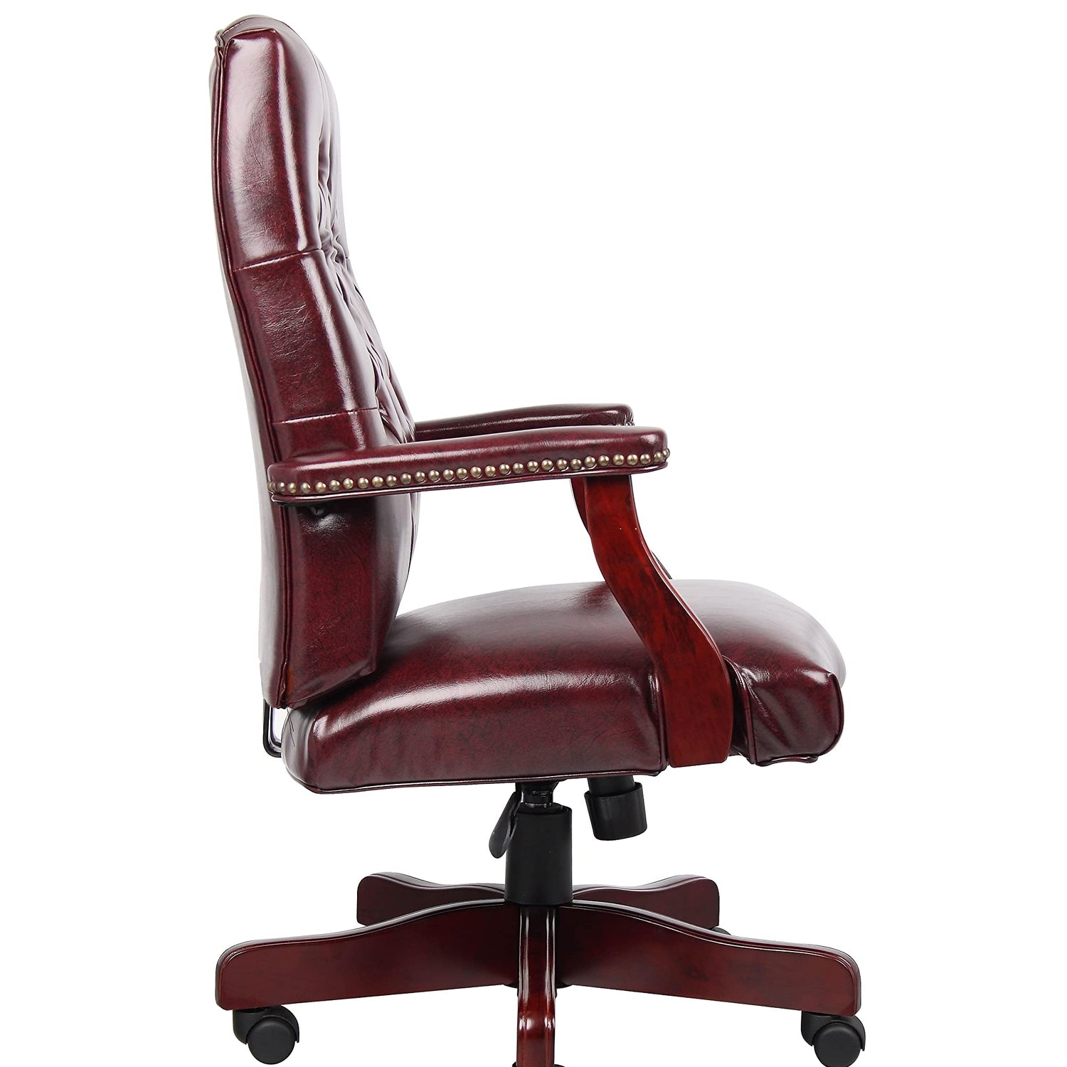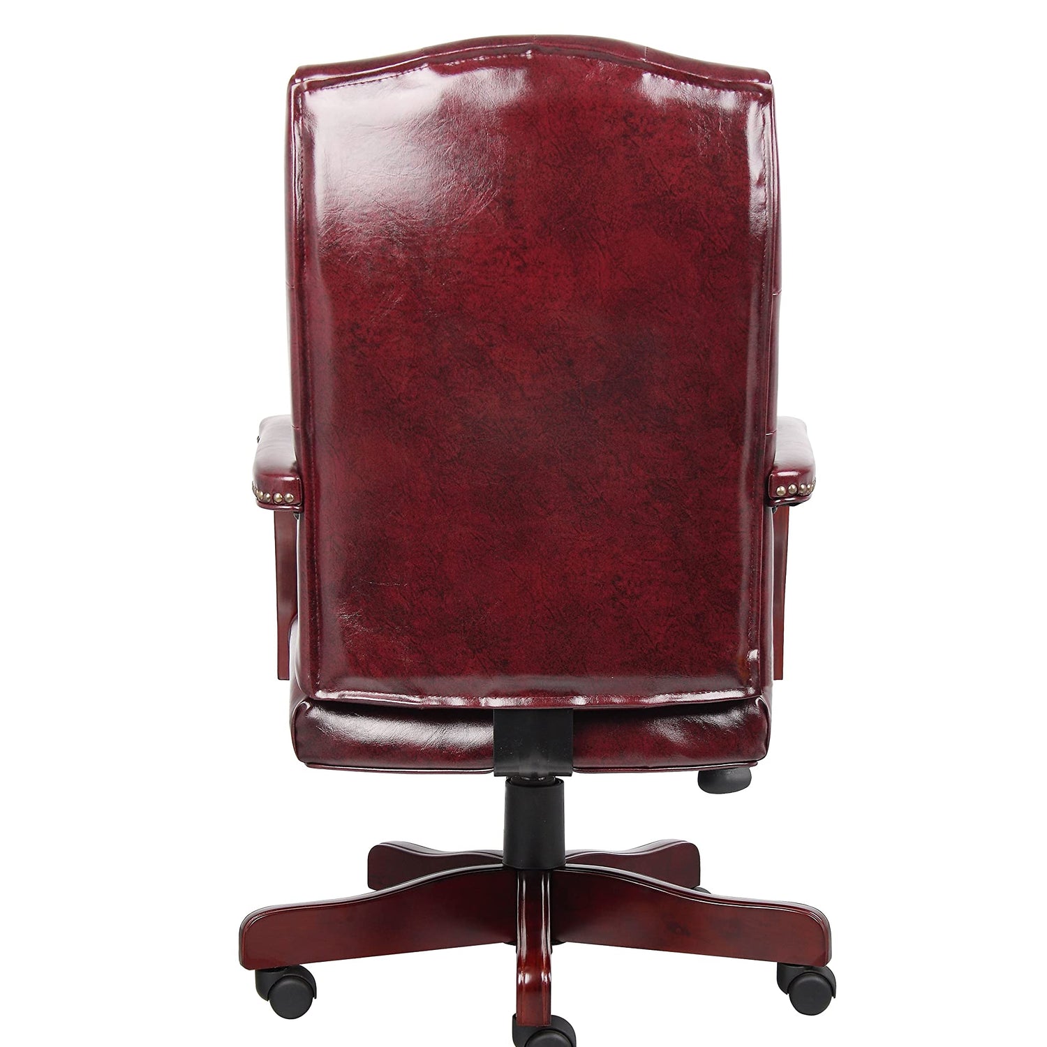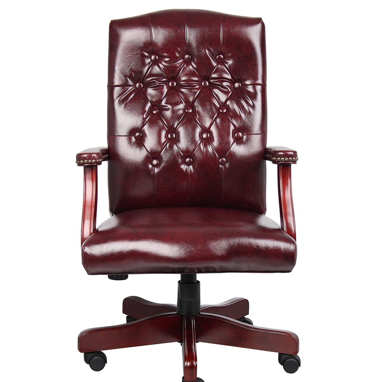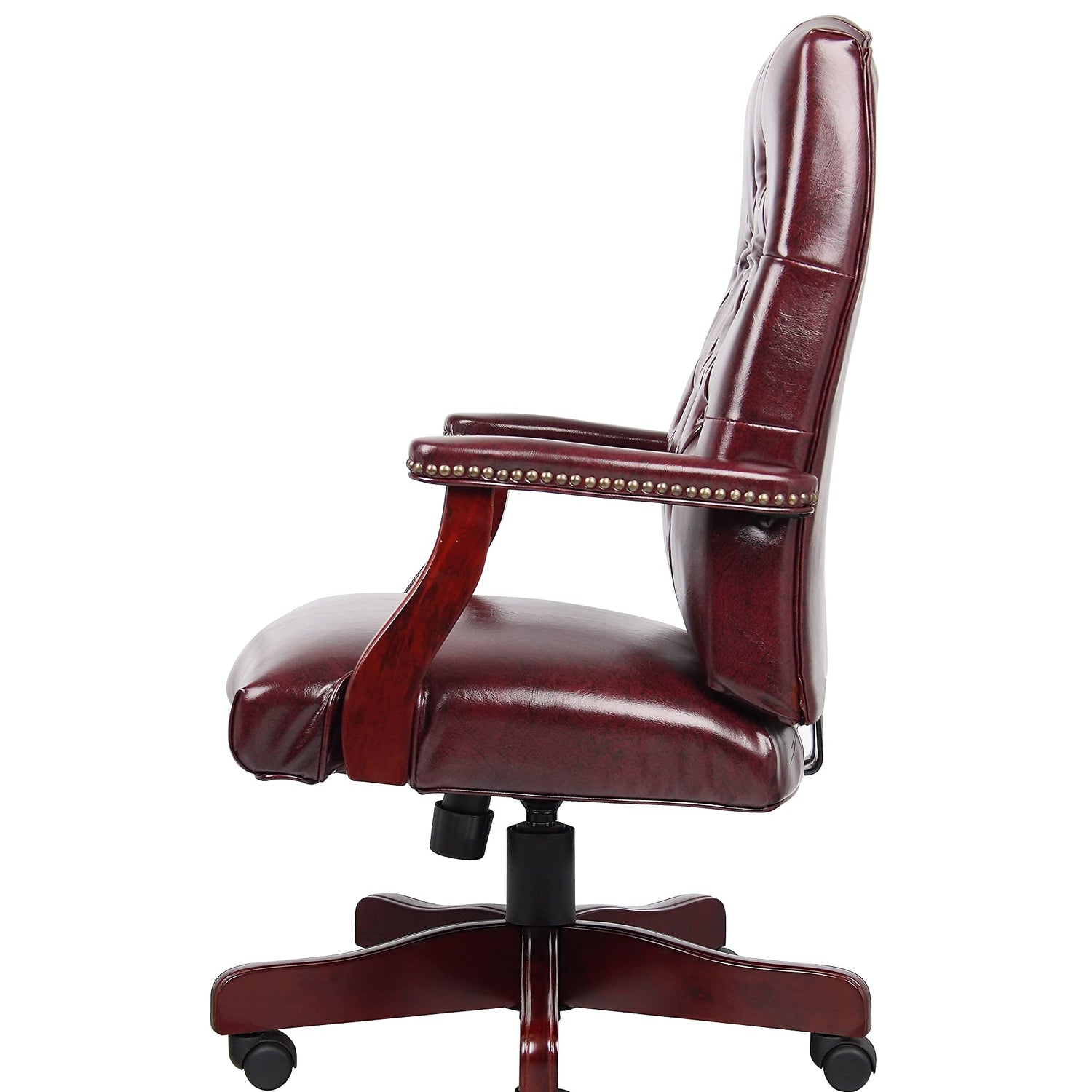 Details: The Boss Classic Oxblood Caressoft Chair With Mahogany Finish by Boss Office Products features five wheels for quickly moving around the office to complete a variety of tasks. The unit measures 27 W x 28 D x 43-47 H inches, where the height can be adjusted to suit your needs. The chair stuns in its classic button tufted styling and beautiful hand applied brass nail head trim. The wood frame is sturdy to provide a long life. Each of these chairs weighs 60 pounds and are able to hold 250 pounds. This unit also matches chair model B959, which is great if adding enough furniture to outfit an office.