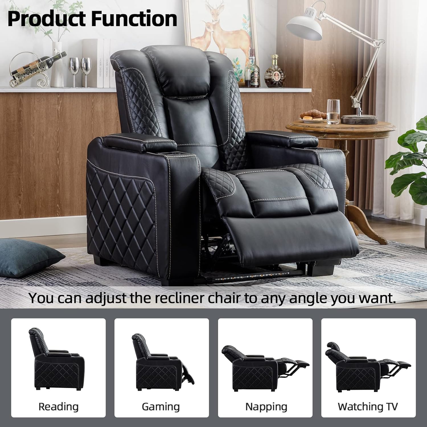 - Home Theater Seating: This power recliner chair with blue LED lights create a cozy theater ambiance, allowing you to experience the home theater feeling at all times. Dual cup holders for drinks and snacks during the movie make your movie night perfect.