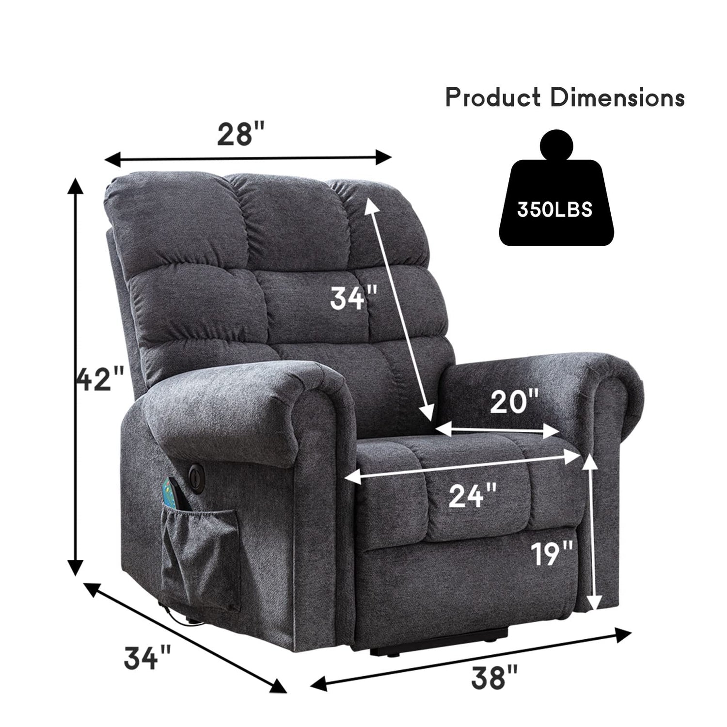 - Oversized Lift Recliner: This power lift chair is featured by extra large appearance, which make it an ideal choice for people in bigger size. Measure - 38"W x 34"D x 42"H, Seat Height - 19", Seat Dimensions - 24"W x 20"D. Weight Capacity: 350lbs. Tips: If you have any concerns regarding your health, consult your doctor before using the product.