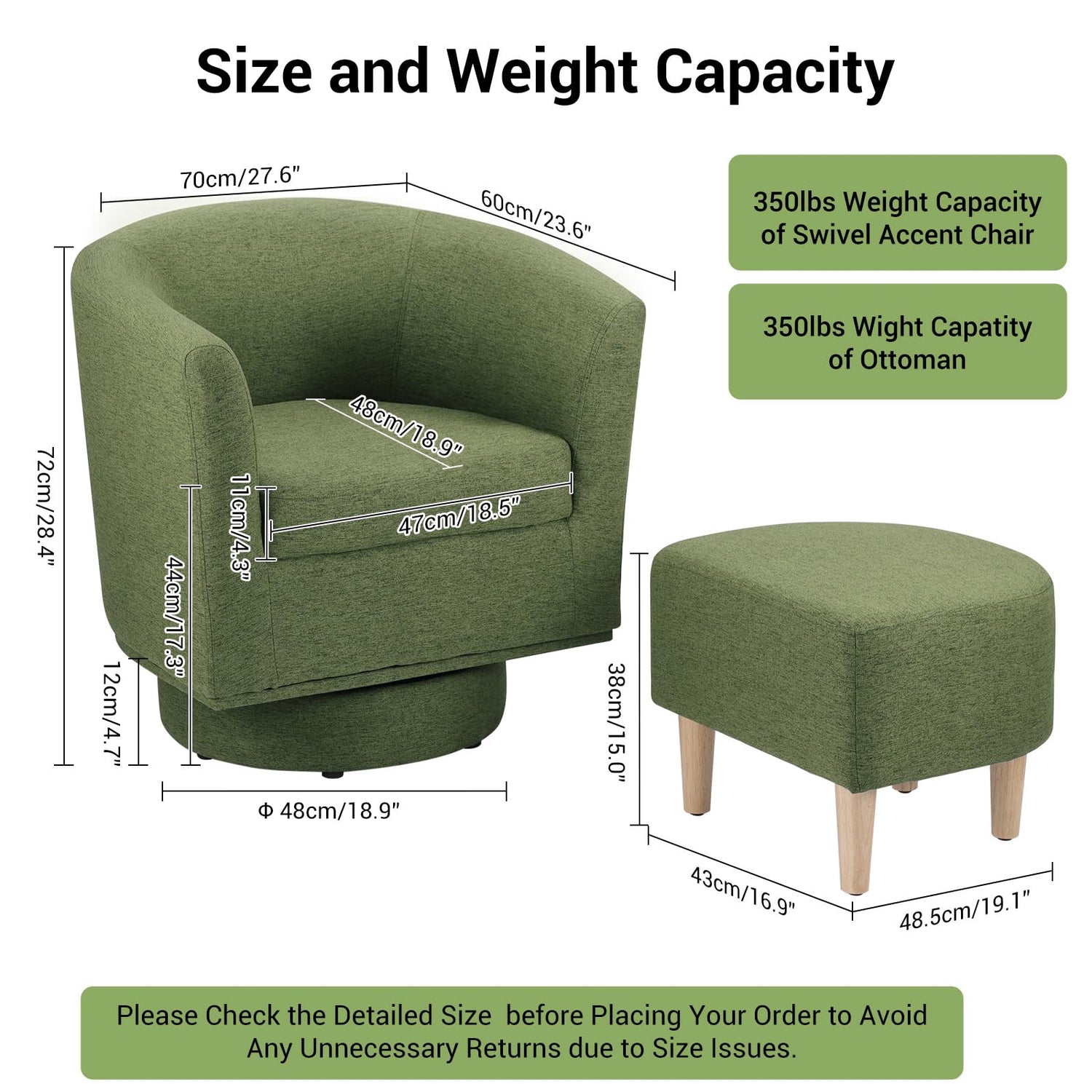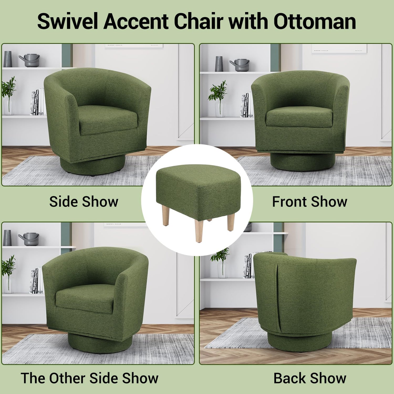- Modern Style That Makes a Statement: Elevate your space with this swivel accent chair with ottoman from DAZONE, designed in a sleek barrel silhouette and upholstered in vibrant green fabric that catches the eye. Whether you're furnishing a living room, bedroom, reading nook, or guest space, this chic chair brings instant style and cozy charm. Ideal for modern apartments, minimalist homes, or dorm rooms. A thoughtful gift for housewarmings or design lovers—make it yours today
