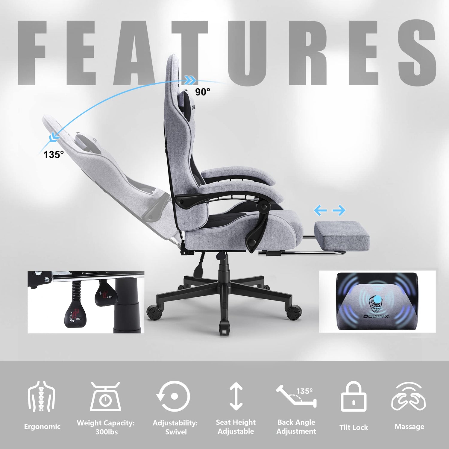 Dowinx Gaming Chair Fabric with Pocket Spring Cushion, Massage Game Chair Cloth with Headrest, Ergonomic Computer Chair with Footrest 290LBS, Black and Grey
