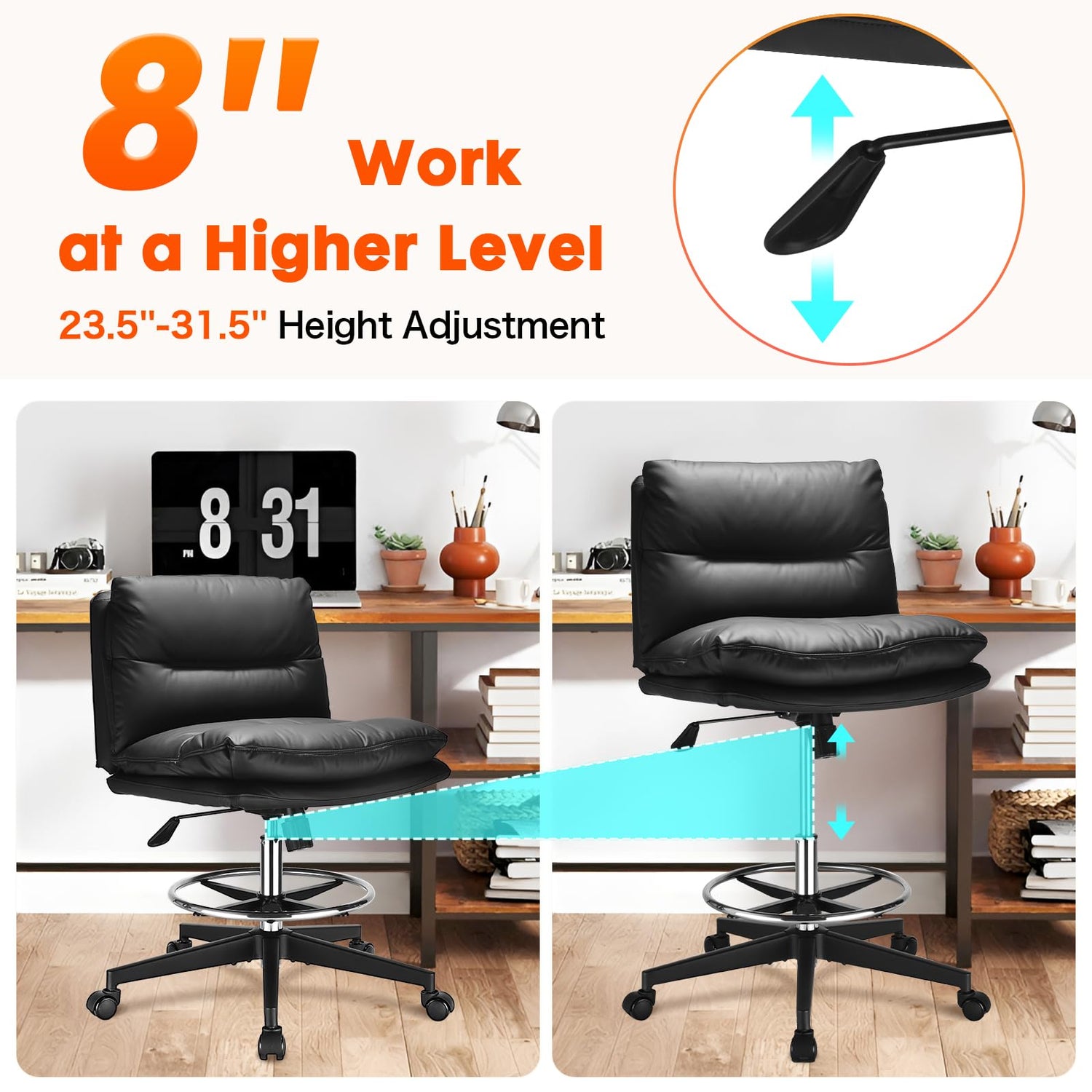 - EXTENDED HEIGHT DESIGN - PERFECT MATCH: The tall office chair can be adjusted by 8 inches (from 23.5'' to 31.5'') to accommodate different heights and needs; while the footrest ring is also adjustable: it provides reliable feet support when the chair is raised, alleviating pressure on your legs. This tall drafting chair complements standing desks, drafting desks, and regular tables