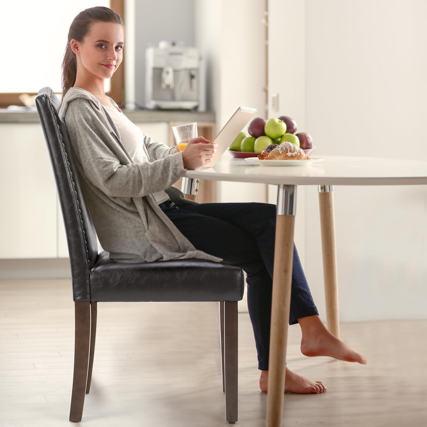 • Modern Style: The streamlined silhouette and sleek shape of the dining chair bring an elegant style to the dining room. Numerous decorative rivet inset around the cushion and back add a luxurious and unique feel to dining room chairs