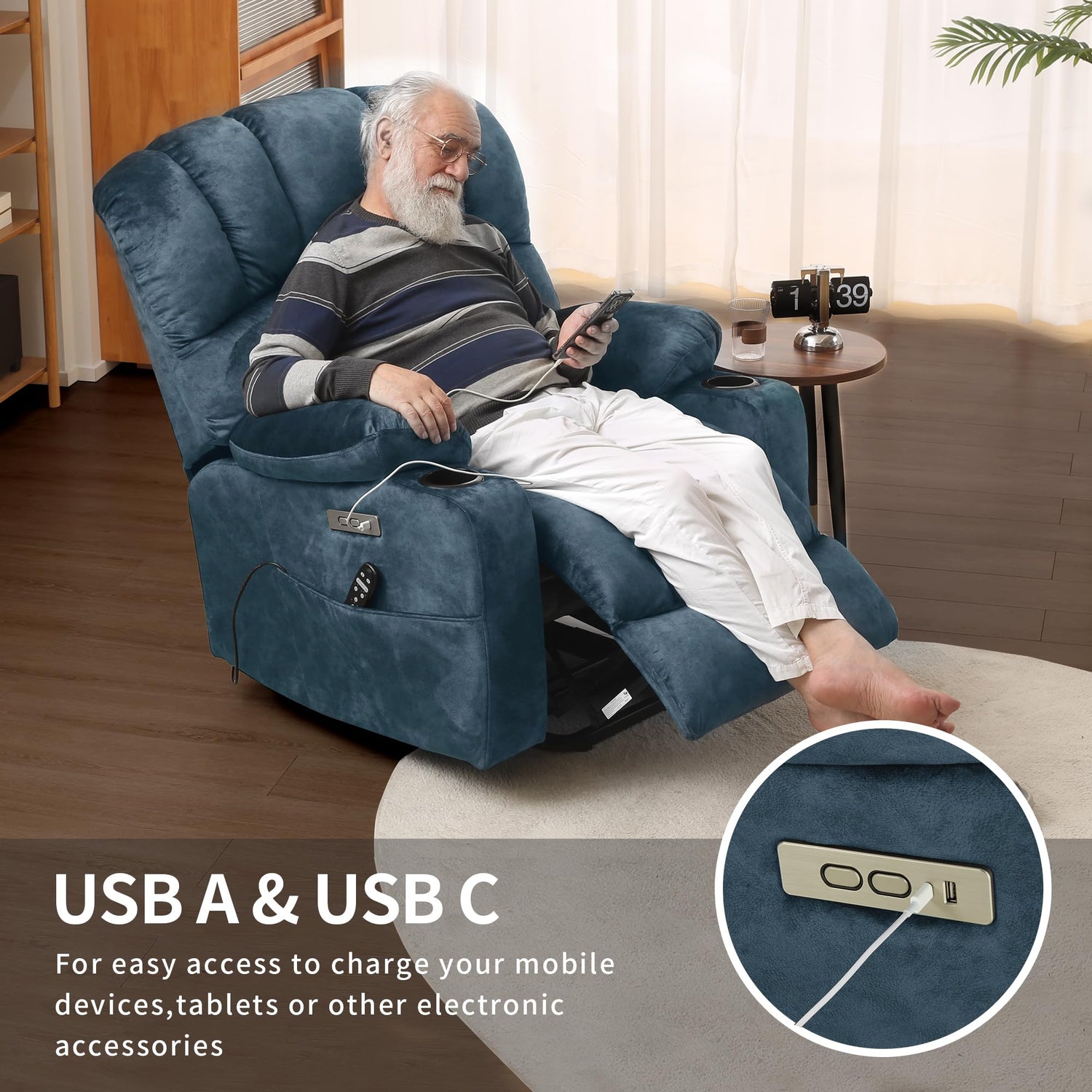 - 【More Conveniences】Duraspace recliner's built-in dual USB ports allow you to charge your mobile devices while enjoying a movie or using your favorite apps. There are 2 cup holders and side pockets to meet your daily needs.