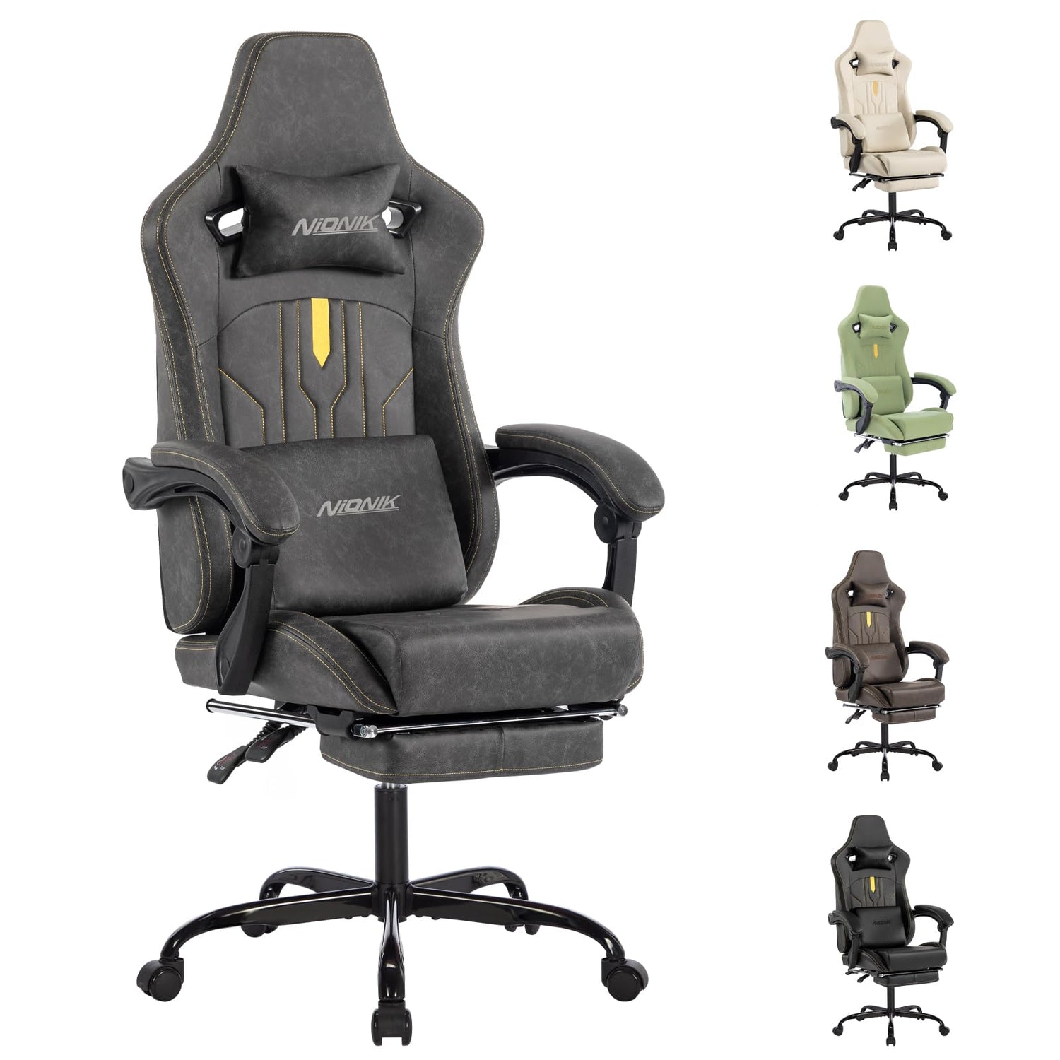 Gaming Chair, Video Game Chair with Massage Lumbar Support and Footrest, Comfortable Ergonomic Computer Chair with Linkage Armrests, Height Adjustable Racing Game Chair Pu Leather for Adults, Grey