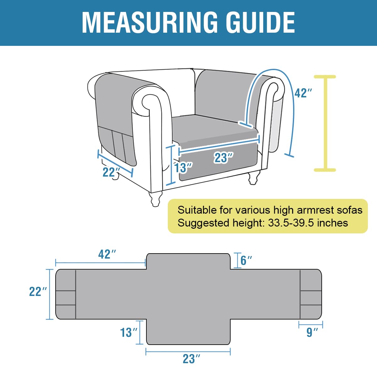 - GREAT FIT: Chair size fit the seat width up to 23 inch; Loveseat size fit the seat width up to 48 inch; Sofa size fit the seat width up to 68 inch; XL Sofa size fit the seat width up to 78 inch. Kindly measure before ordering, see the measuring guide in photos for a list of all measurements. Please note that the armrest covers upgraded and extended, making it more suitable for sofas with high armrests