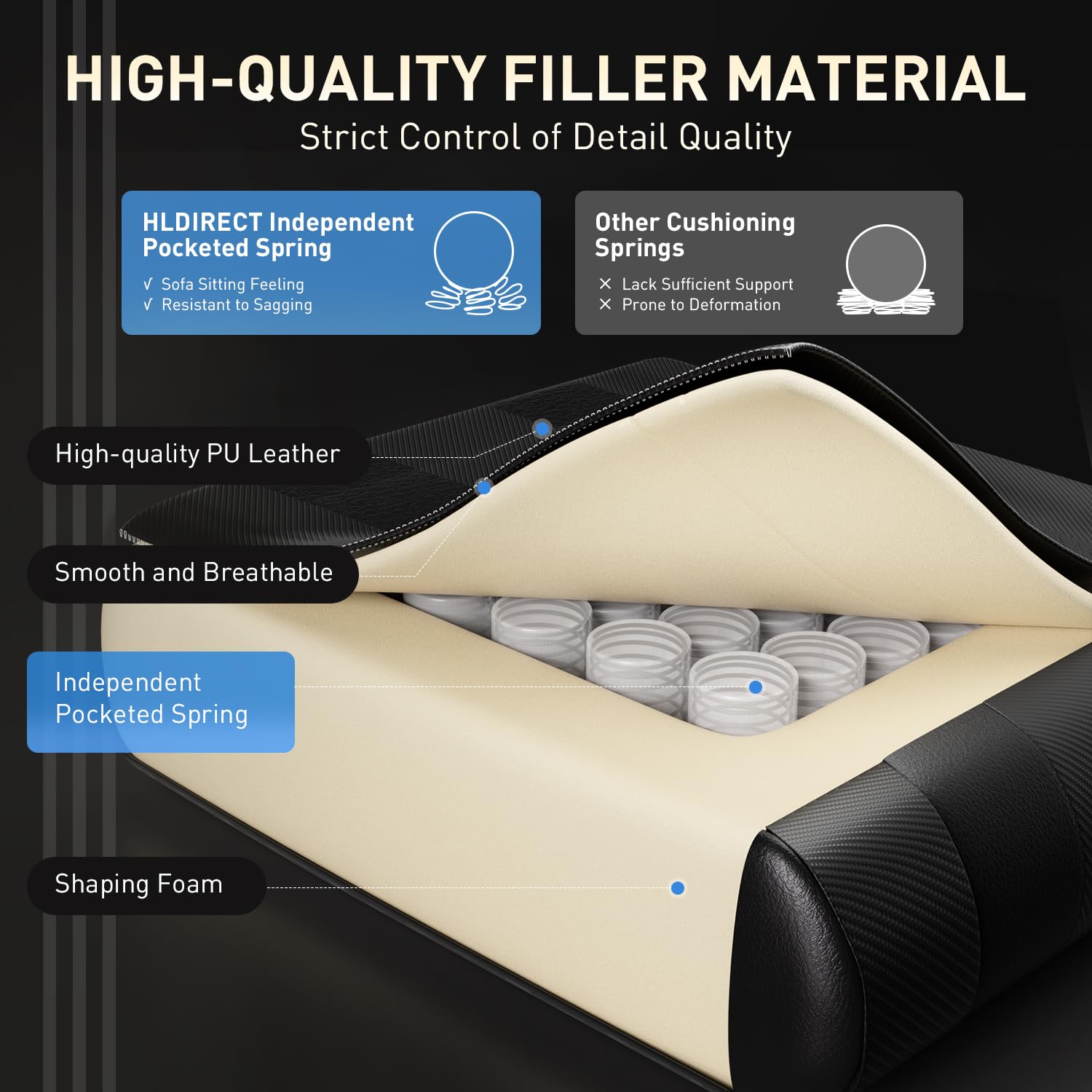 - 【No Collapse After Long Sitting】We've inserted the individually pocketed springs from mattresses into the gaming chair's seat cushion. Special-tuned, each spring flexibly adjusts based on force points, jointly enabling precise weight distribution. Wrapped with 45D high-quality, high-resilience sponge outside, it ensures no collapse during long sitting and buffers vibrations subtly. This guarantees no sagging during long sits, buffers vibrations subtly, and offers a cloud-like comfort. Their shape and support duration are 50% longer than traditional materials. The gaming chair cushion's surface air holes boost the spring system's load, cut noise, and enhance the overall sitting feel.