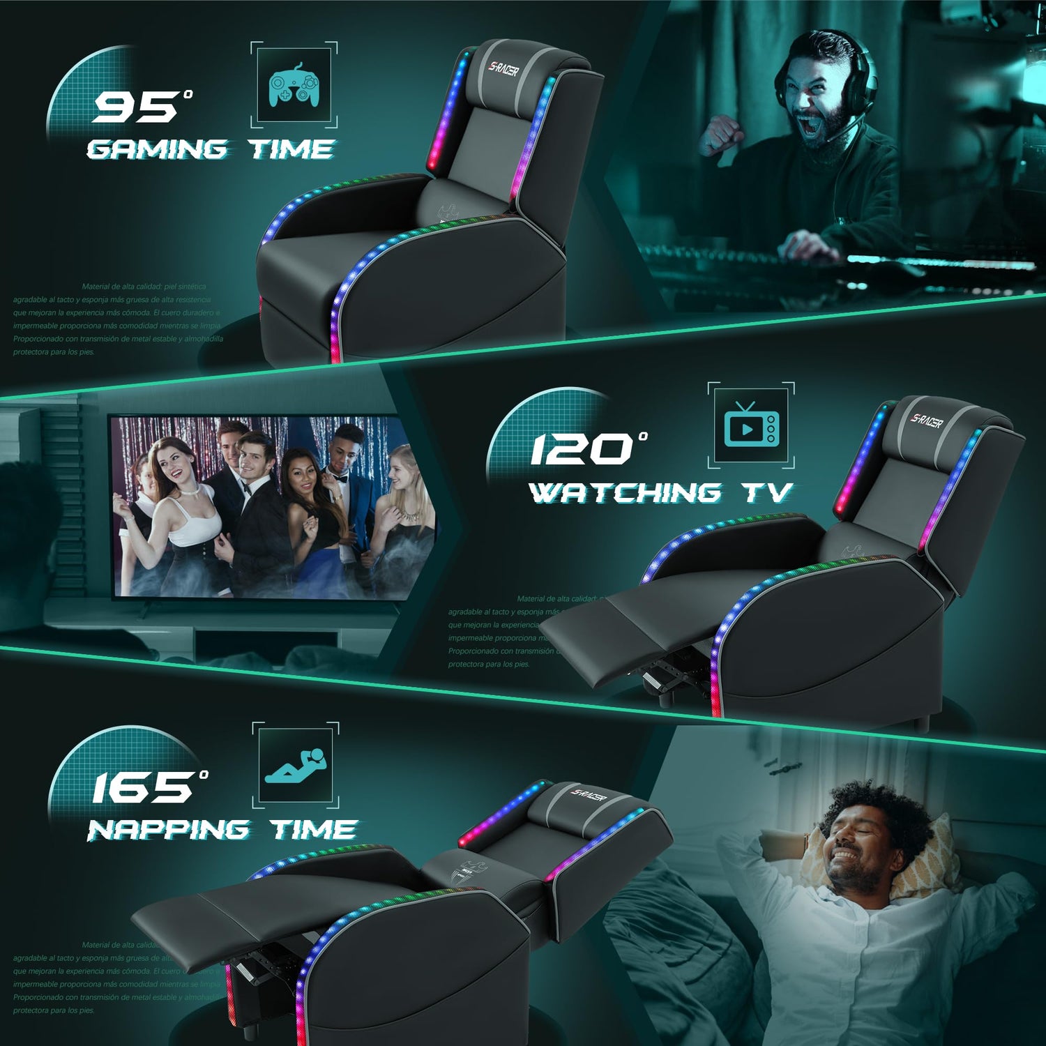 • Quality Material: This gaming recliner is made with comfortable skin friendly high-quality PU leather and high-resilience & high-density thicker sponge which create a more comfortable gaming environment.