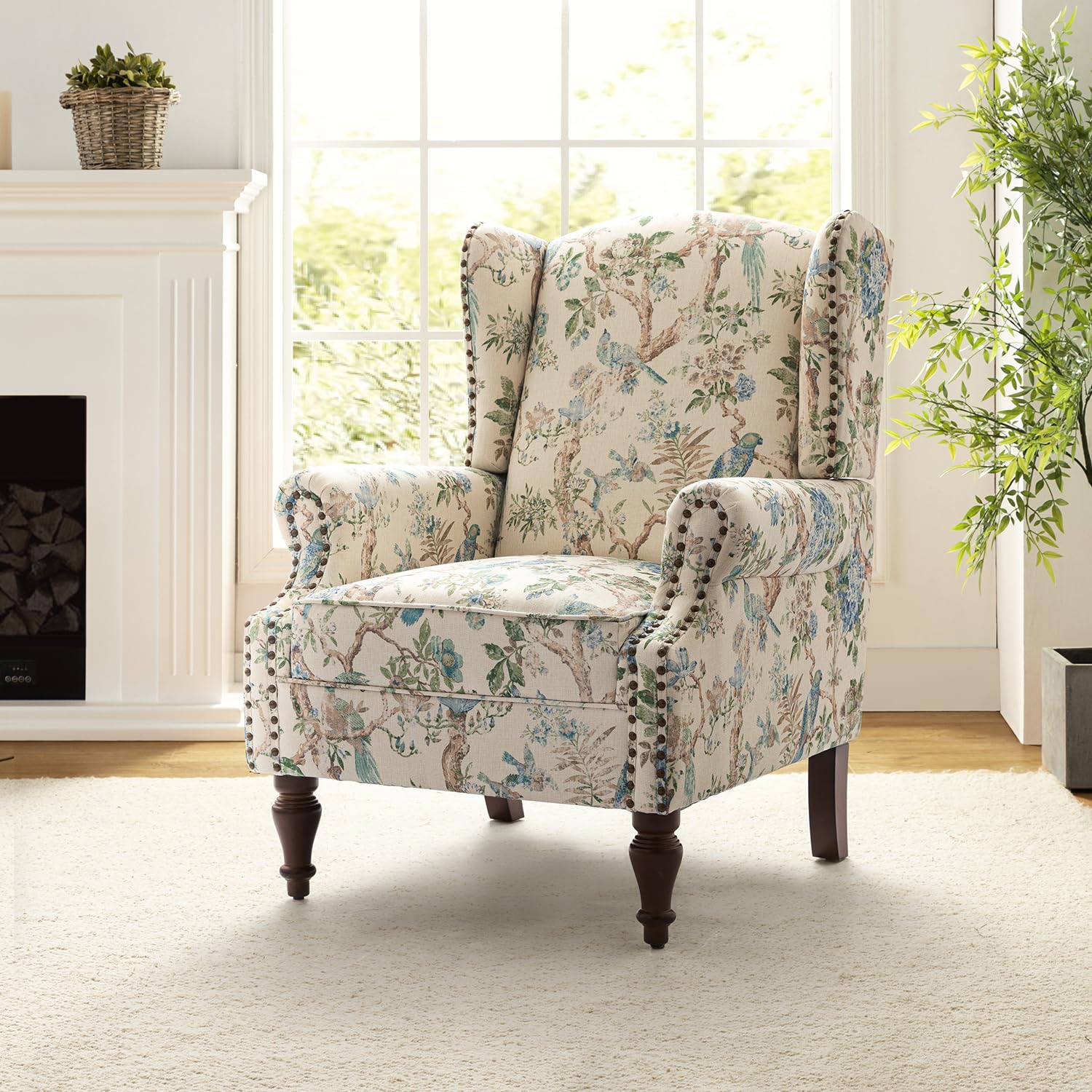 HULALA HOME Wingback Accent Chair with Floral Pattern Design, Traditional Fabric Armchair with Nailhead Trim and Retro Wooden Legs, Bird