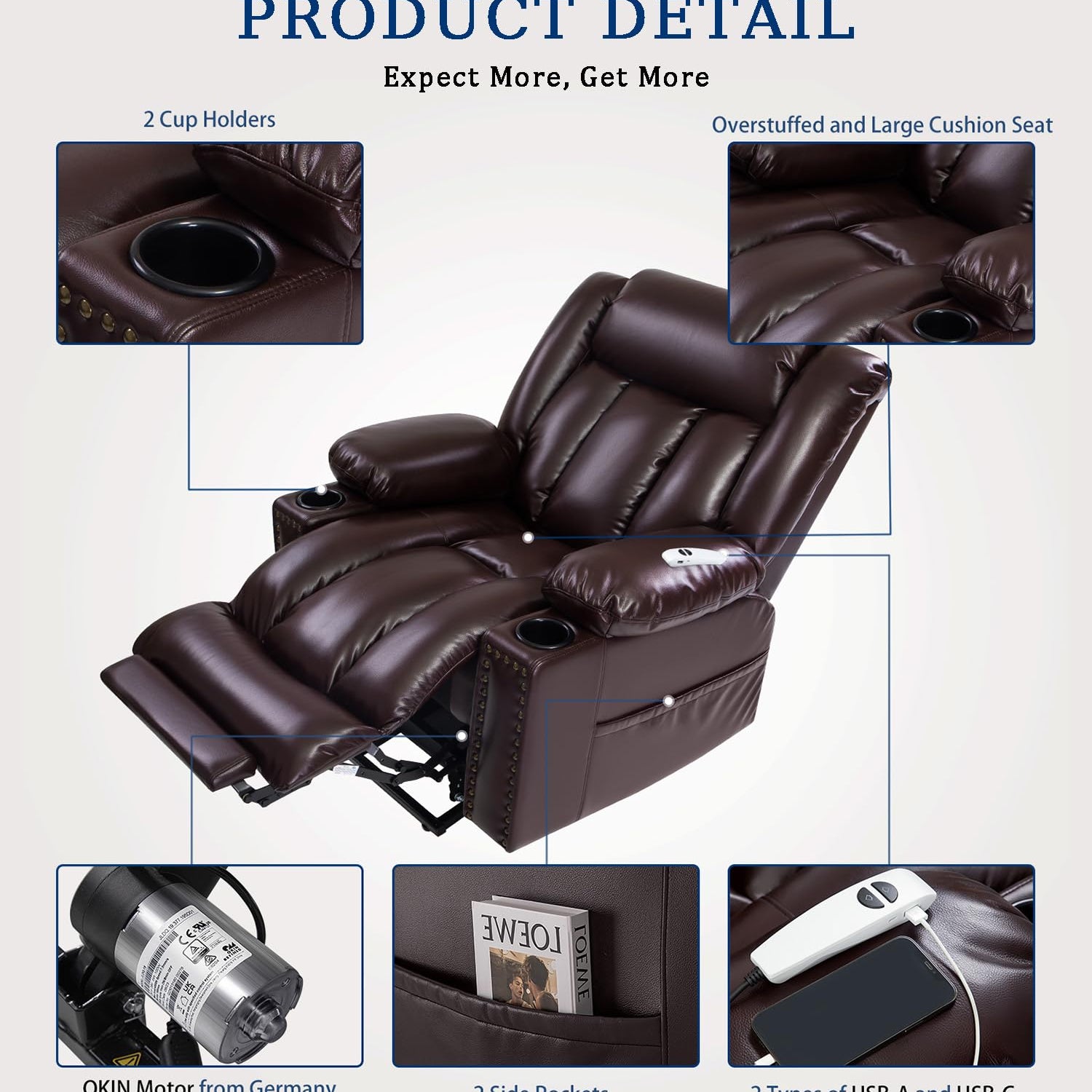 Large Power Lift Chairs Recliners for Elderly with Heated and Massage, Overstuffed Adjustable Lift Chairs, 3 Positions, Breathable Leather, USB-A and USB-C, Cup Holder, Side Pocket Dark Brown