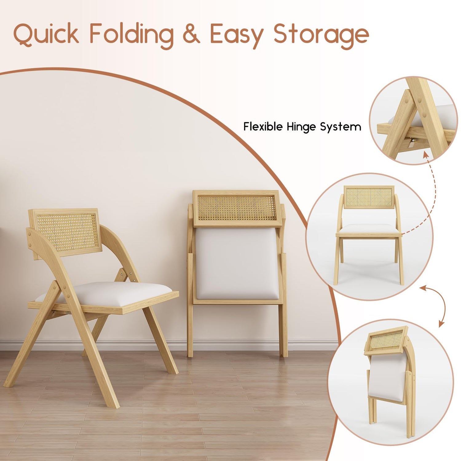 lavimiya Beige Folding Dining Chairs Set of 2, Wooden Foldable Dining Chairs, Modern Mid Century Leather Rattan Dining Room Chairs with Padded Cushion for Kitchen, Living Room, Small Space