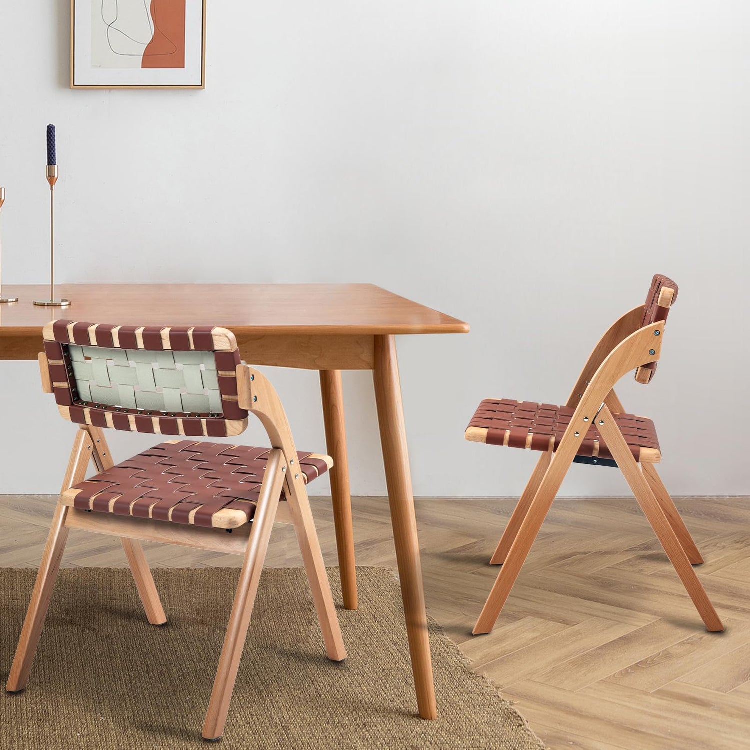 Luteren Folding Chairs Set of 2, Wooden Foldable Dining Chairs, Stackable Folding Extra Chair with Breathable Leather-Woven Design for Indoor & Outdoor, Brown