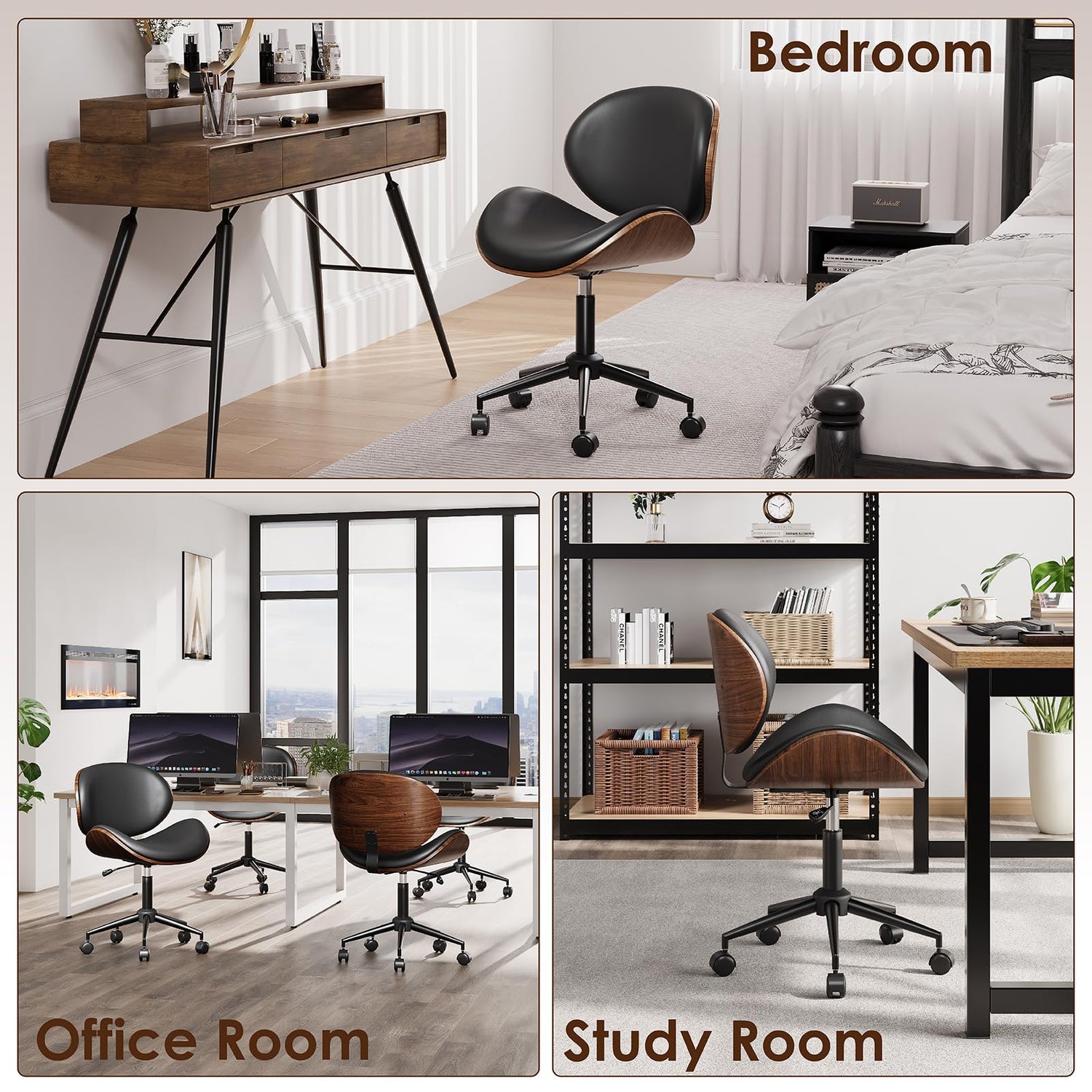 LUXOAK Ergonomic Home Office Desk Chair Set of 2, Mid-Century Modern Armless Chair with PU Leather/360°Swivel Wheels/Seat Height Adjustable for Office, Study, Black