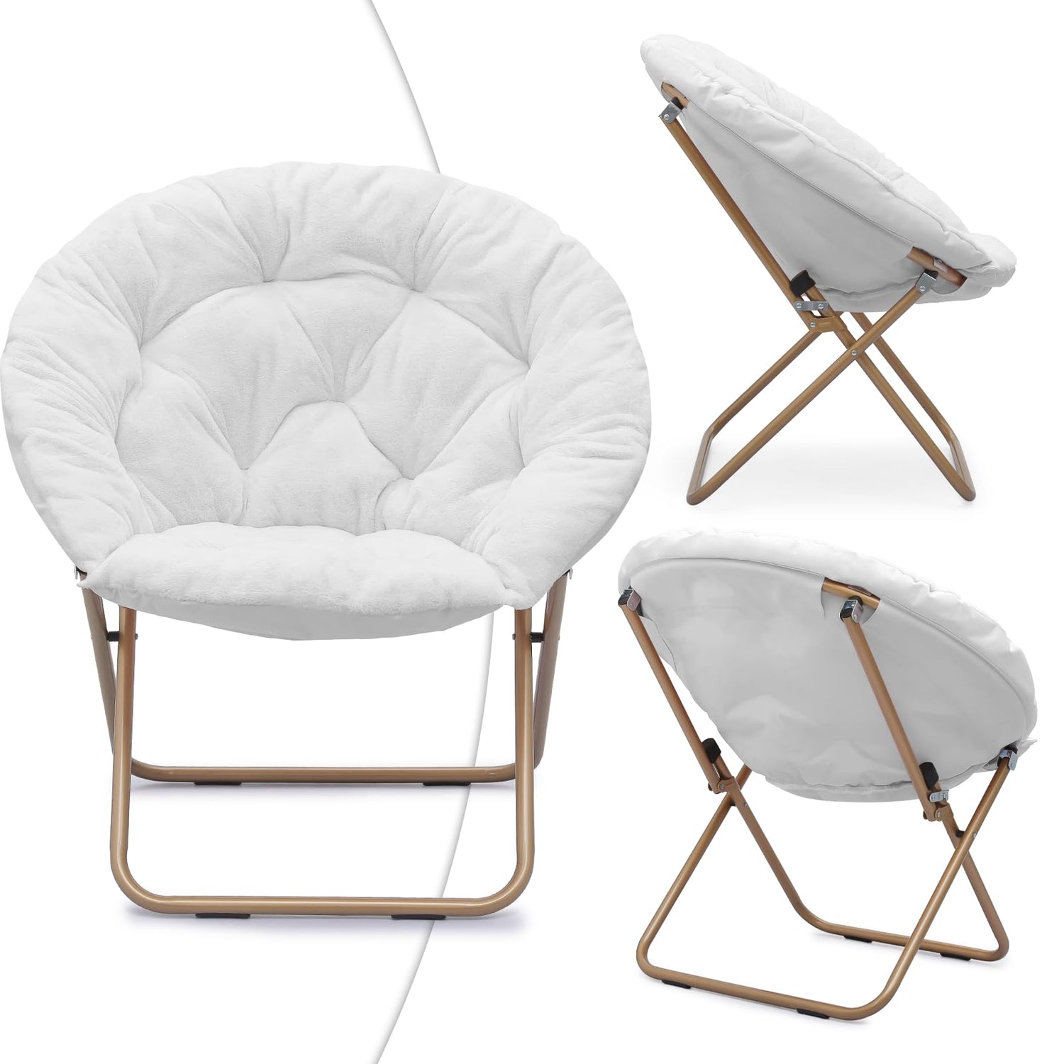 Magshion Saucer Chair for Adults, Oversized Folding Cozy Moon Chair with Gold Metal Frame, Furry Faux Fur Comfy Lazy Seat for Bedroom, Living Room, Dorm Room, Apartment (White)