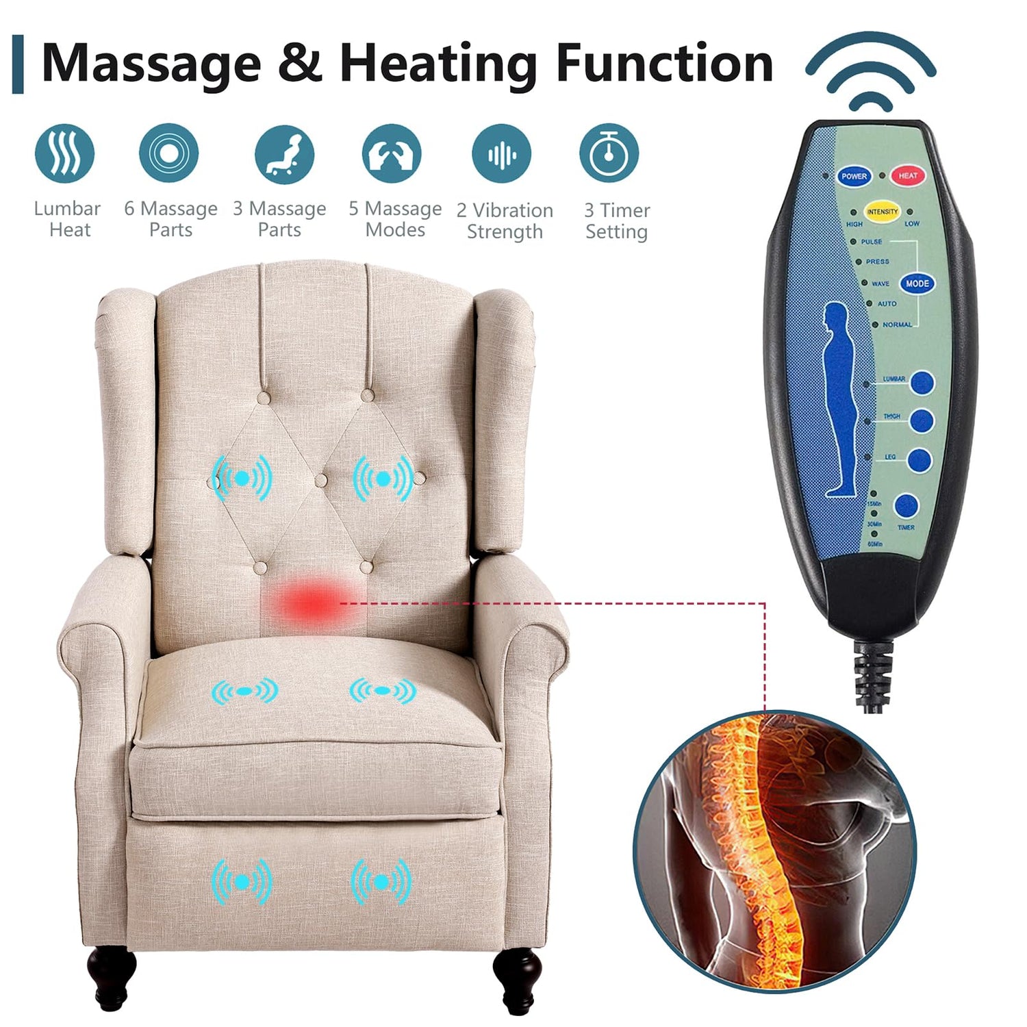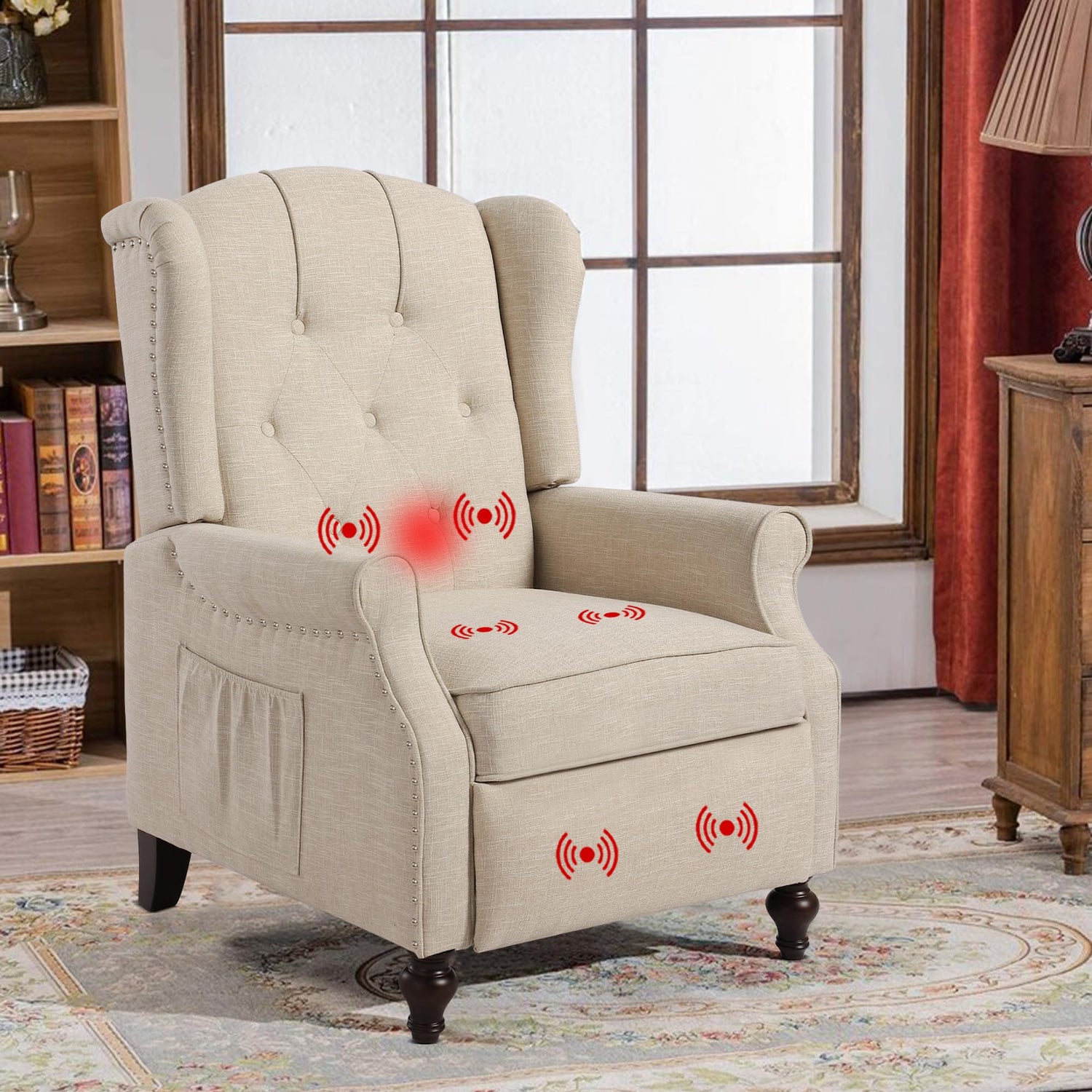 Mid-Century Wingback Recliner Chair with Massage & Heat, Accent Recliner with Nailhead Trim, Armchair with Side Pockets & Solid Wood Legs, Adjustable 3-Position Reclining Chair for Living Room, Beige