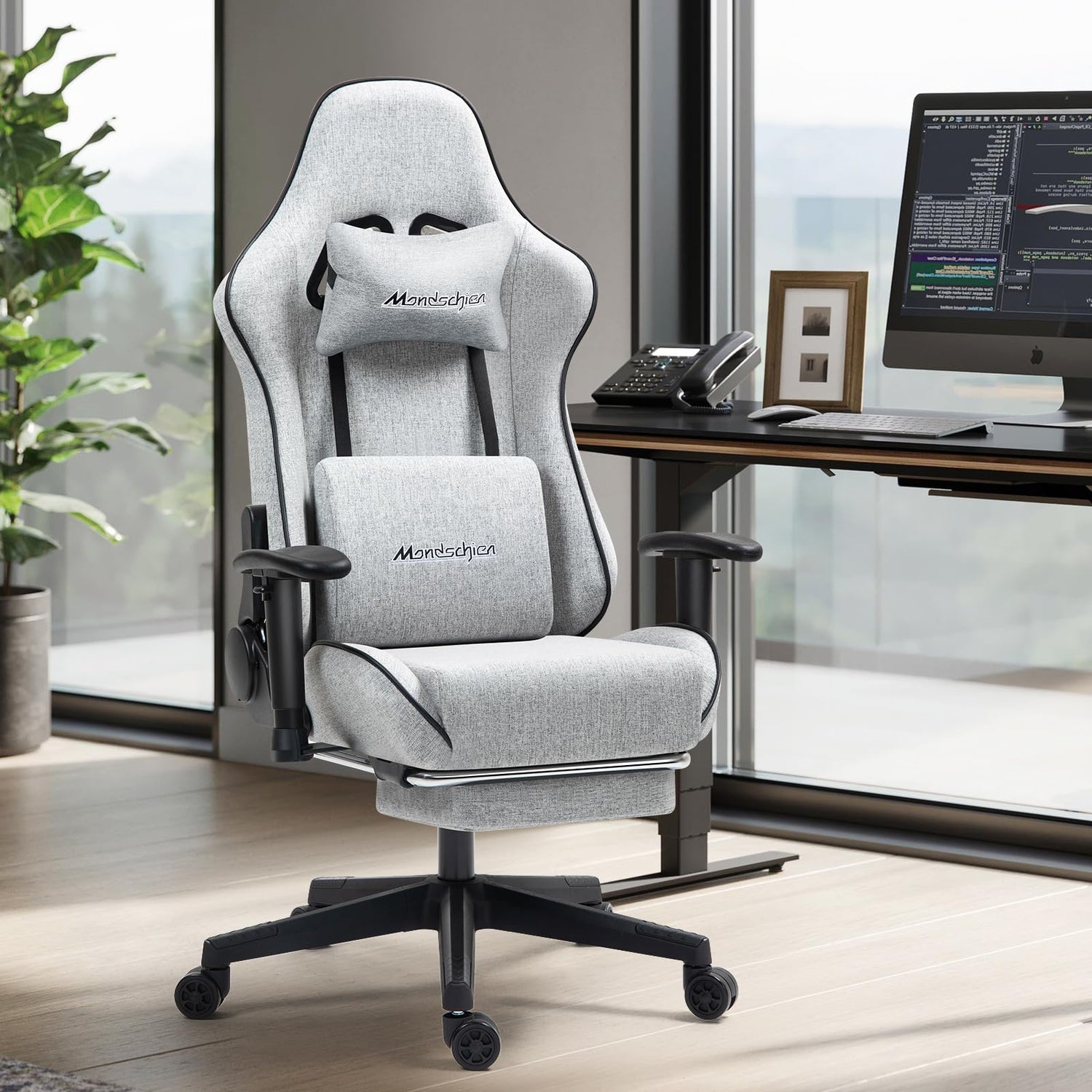Mondschein Gaming Chair with Pocket Spring, Fabric Office Chair Massage Computer Chair with Footrest, High Back Ergonomic Reclining Desk Chair Racing Game PC Chair Adjustable Armrest Headrest (Grey)