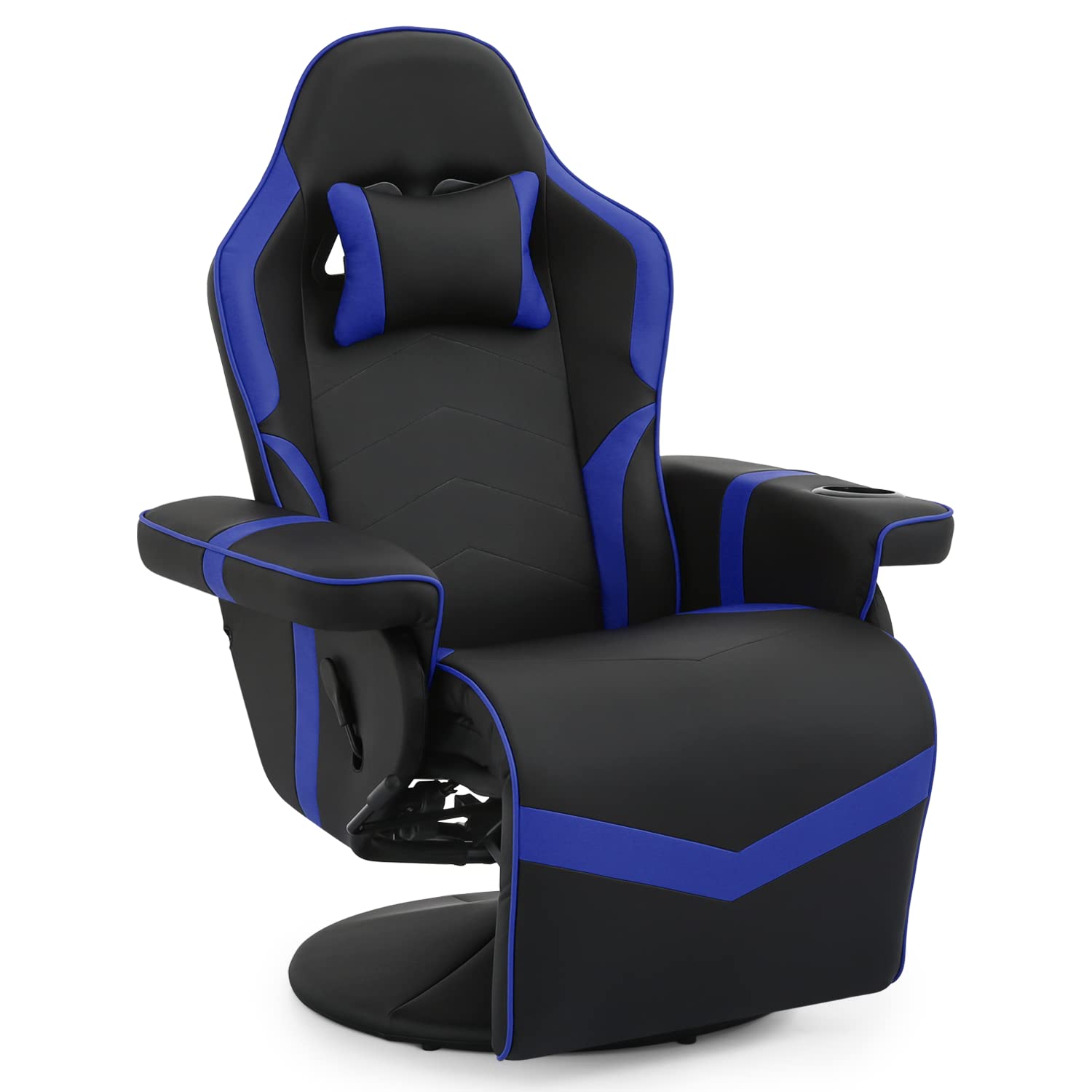 MoNiBloom Reclining Gaming Chair Ergonomic Game Recliner Chair Adjusted PU Leather Reclining Video Gaming Single Sofa with Retractable Footrest, Swivel Theater Seating Gaming Couch w/Cup Holder, Blue