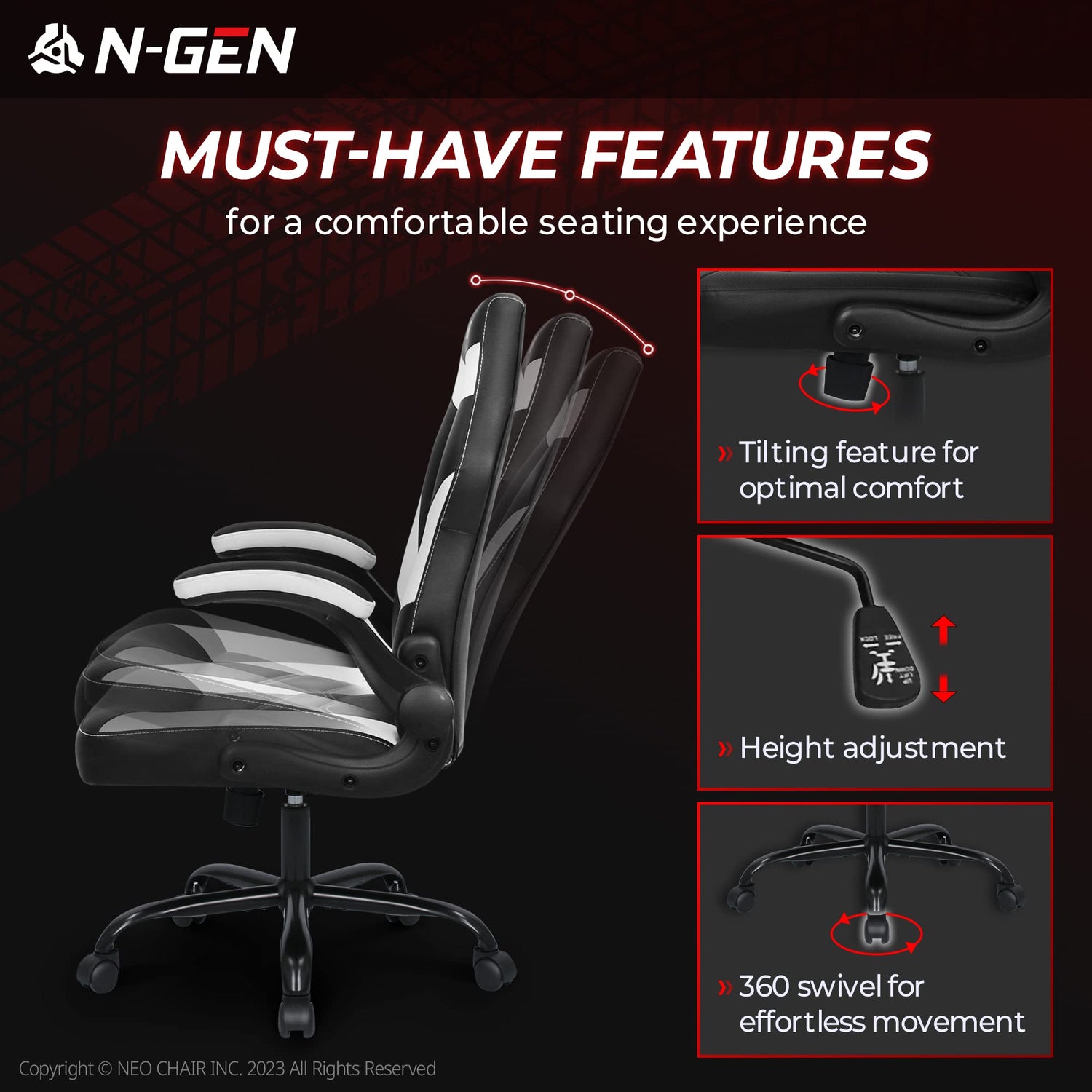N-GEN Video Gaming Computer Chair Ergonomic Office Chair Desk Chair with Lumbar Support Flip Up Arms Adjustable Height Swivel PU Leather Executive with Wheels for Adults Women Men (White)