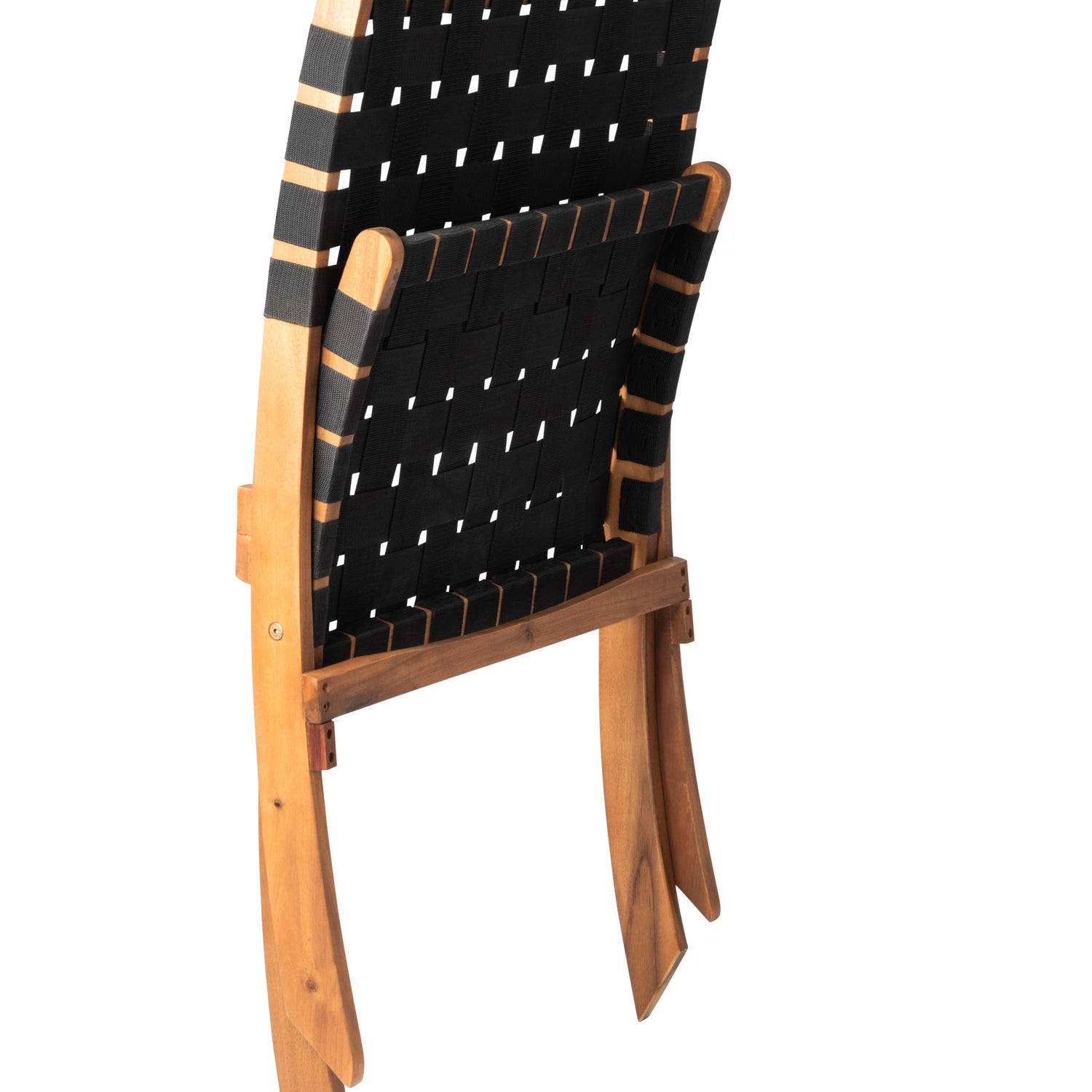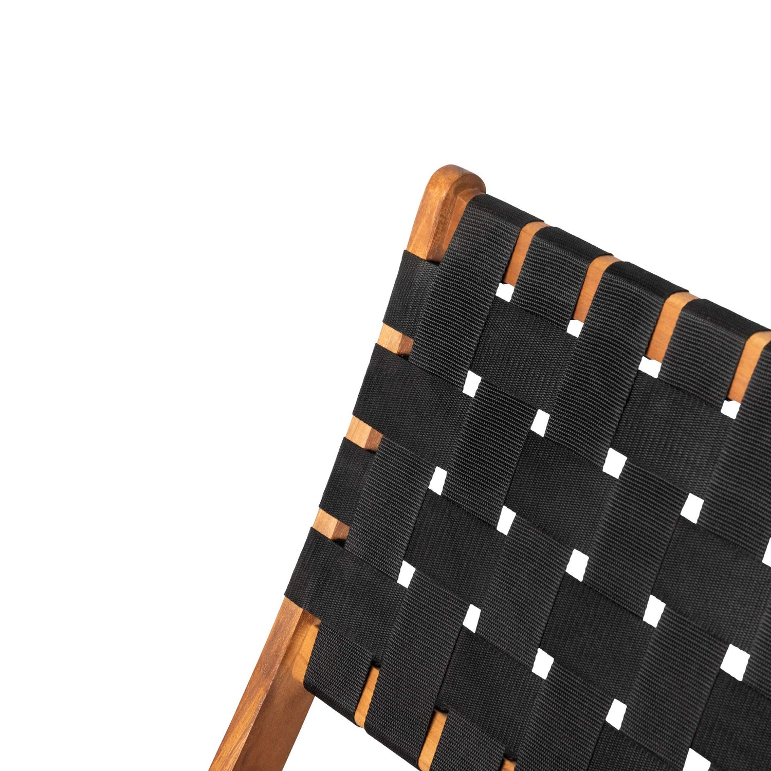 • FEATURES: Sturdy black nylon webbing seat and backrest | Solid acacia wood construction | Beautiful teak-toned oiled-wood finish | Chair can be used indoors or out | Low maintenance: just wipe down with soft cloth | No assembly - just unfold | Light weight for transportability.