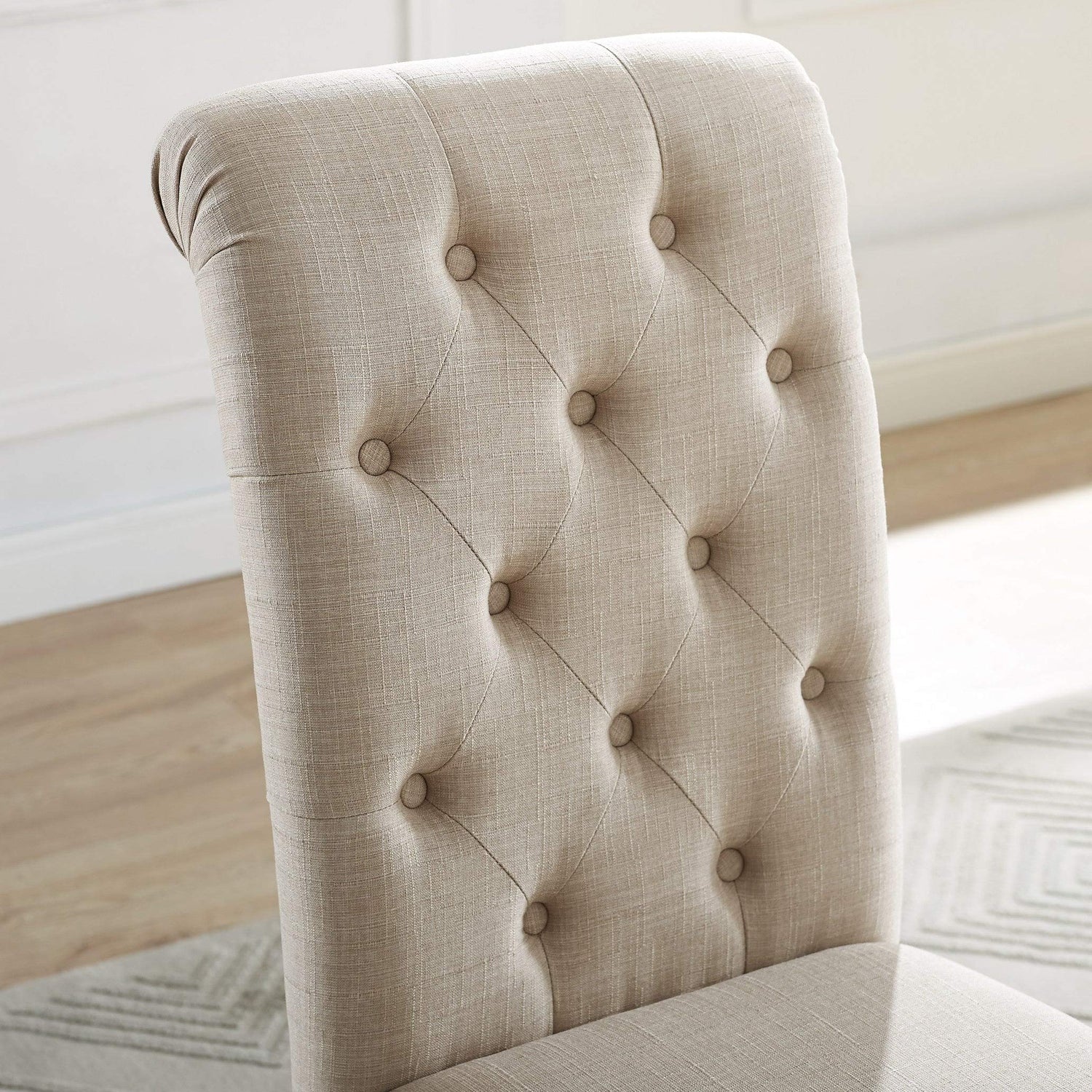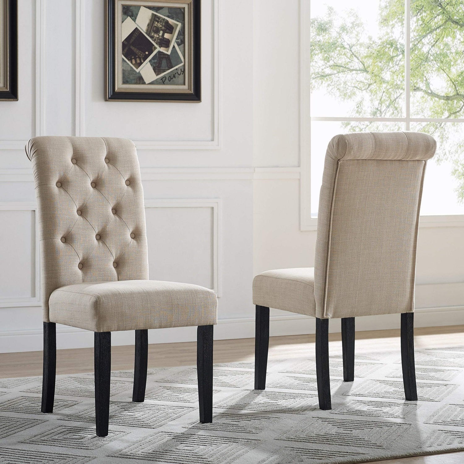 Details: Develop a coordinated seating arrangement in your dining space with this set of two Leviton Asons dining chairs. Fabric upholstery with button tufting lends sophistication to your home, and the dark wood legs provide sturdy support and a visual counterpoint to the seat design. These high-back chairs are padded for comfort.