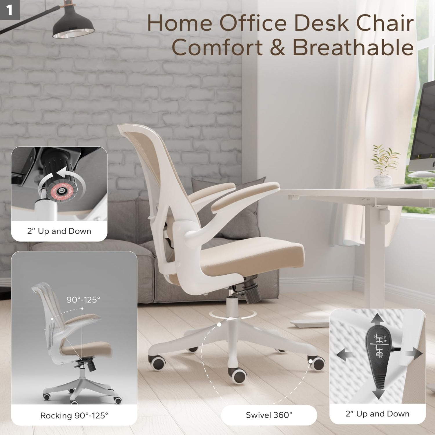 SICHY AGE Office Chair, Ergonomic Desk Chair with Flip-Armrest & Cushion for Lumbar Support, Mid Back Computer Chair with Thickened Cushion, Desk Chair Comfy with Wheels for Study and Work, Khaki