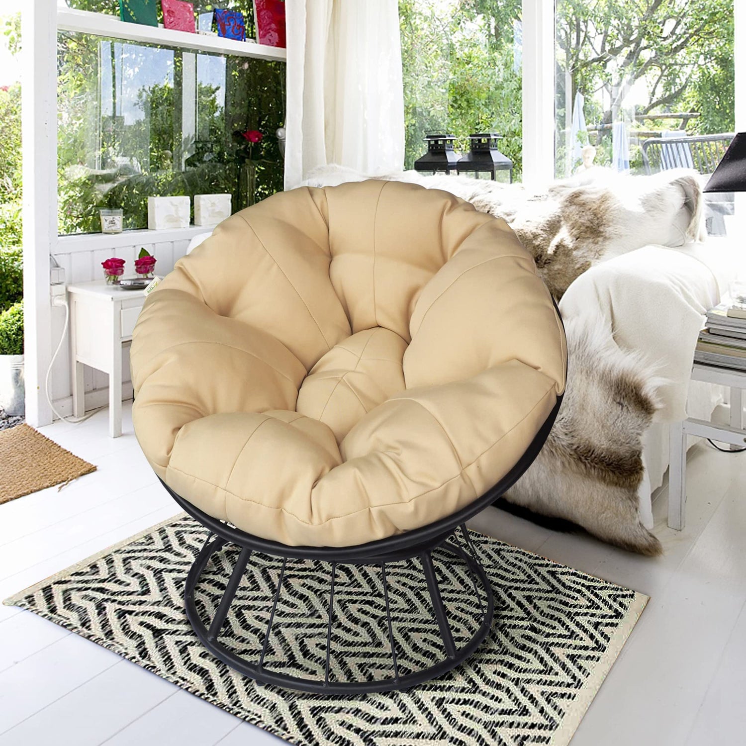 Skypatio Papasan Chair Swivel Patio Chair with Fluffy Cushion, Indoor/Outdoor Lounge Moon Chair Balcony Seats for Home, 35inch, Khaki Cushion