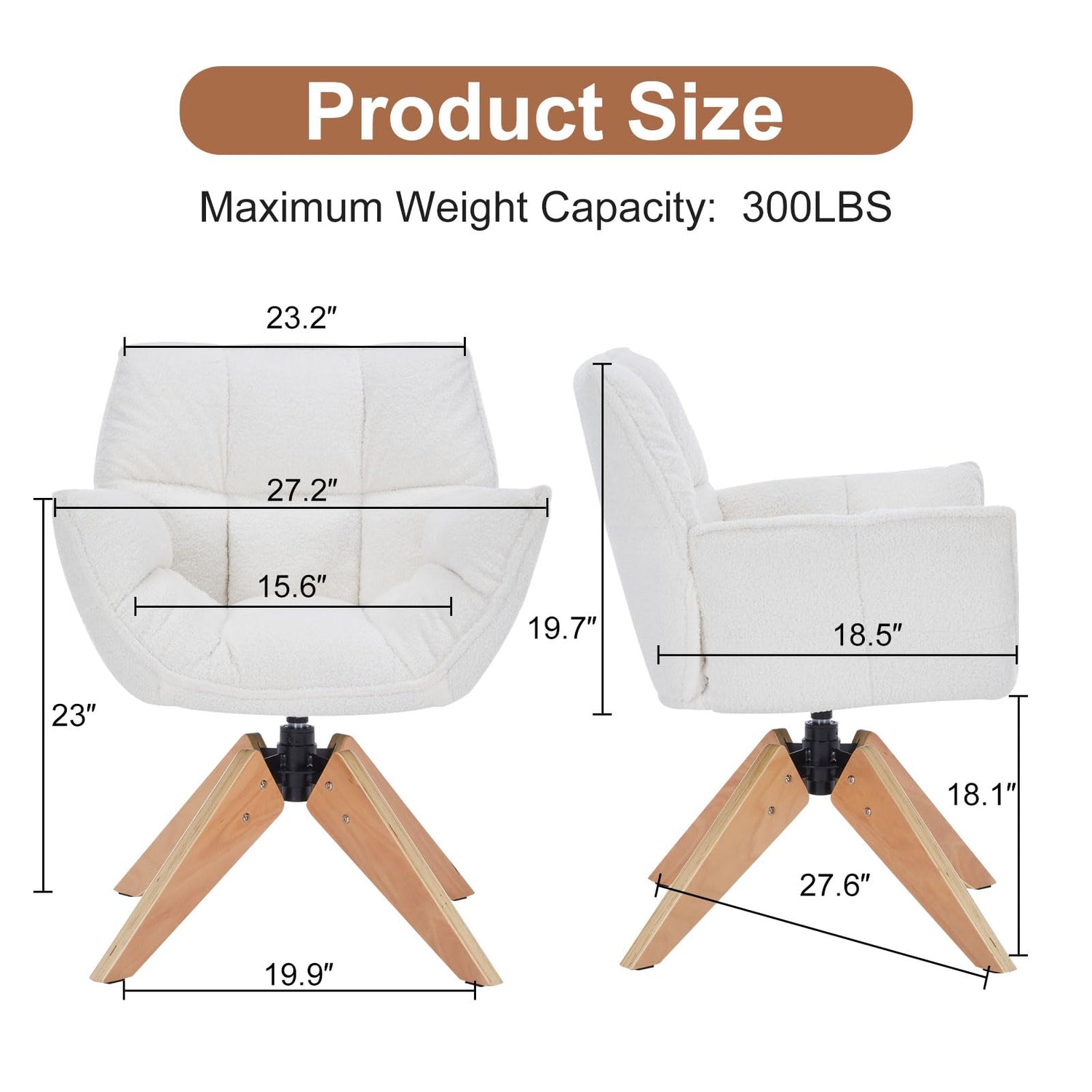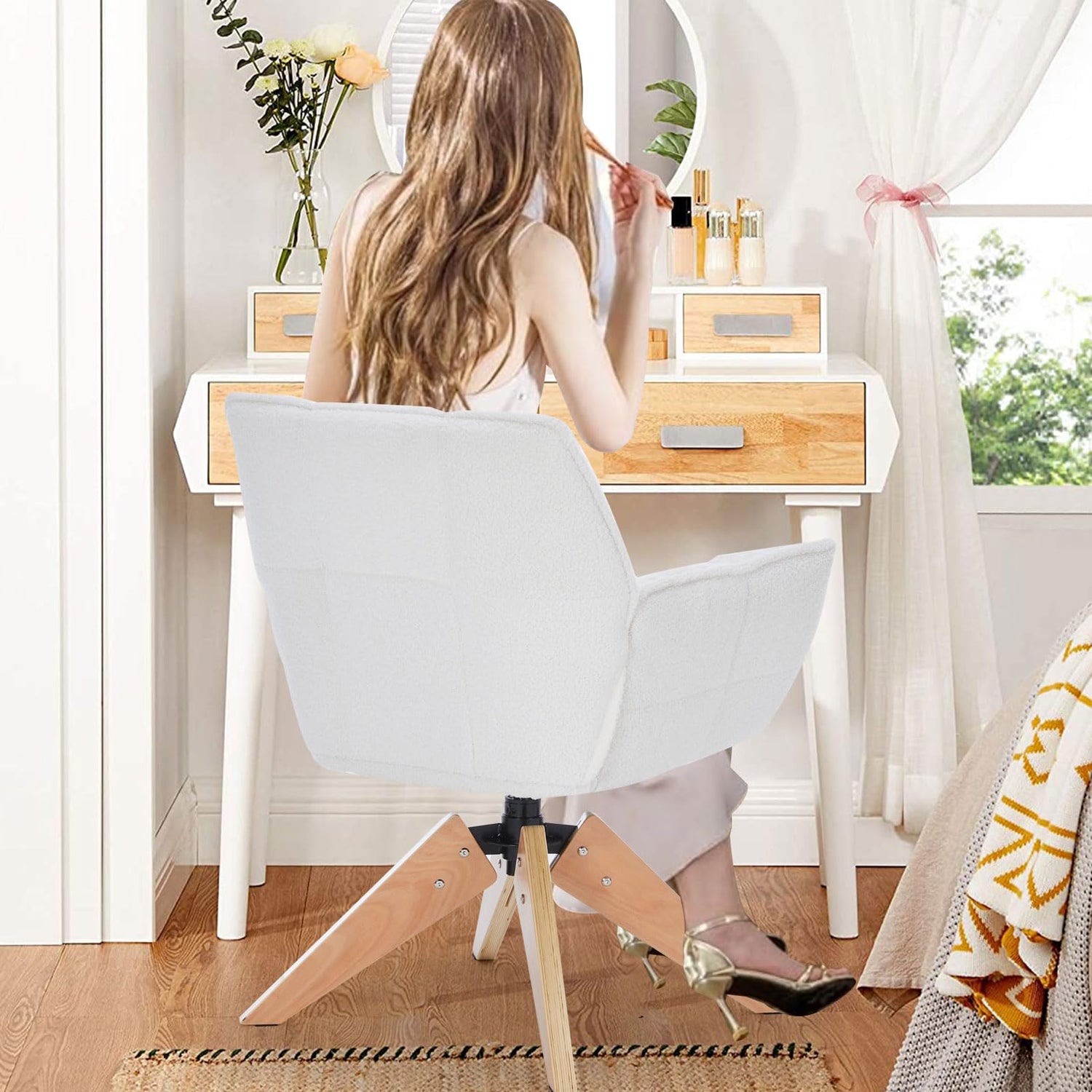 SOERGO Mid Century Accent Chair, Lambs Wool Vanity Chair Modern Cozy Desk Chair no Wheels with Amrest, Wood Legs for Living Room, Reading Room, Bedroom, White