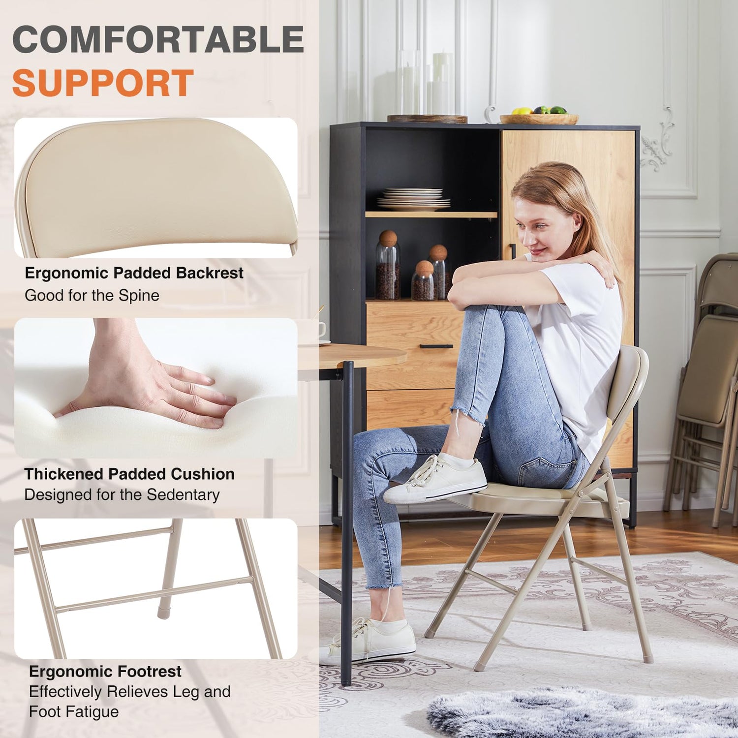 Sweetcrispy Folding Chair 2 Pack, Leather Padded Folding Chairs, Sturdy Metal Foldable Chairs, Easy to Use and Store, Outdoor and Indoor, for Home, Office, Party, Comfy, Kahki