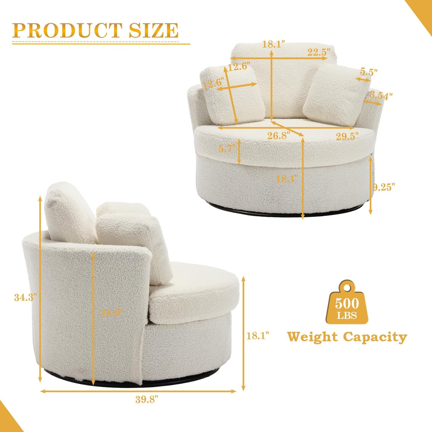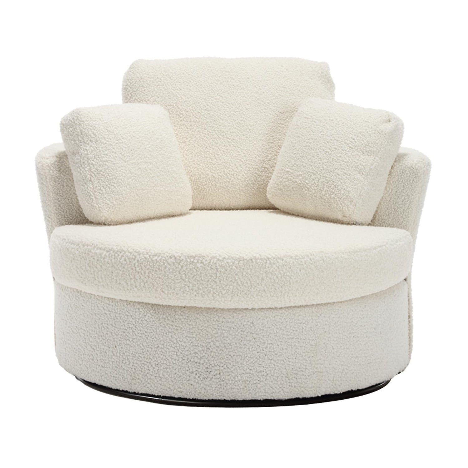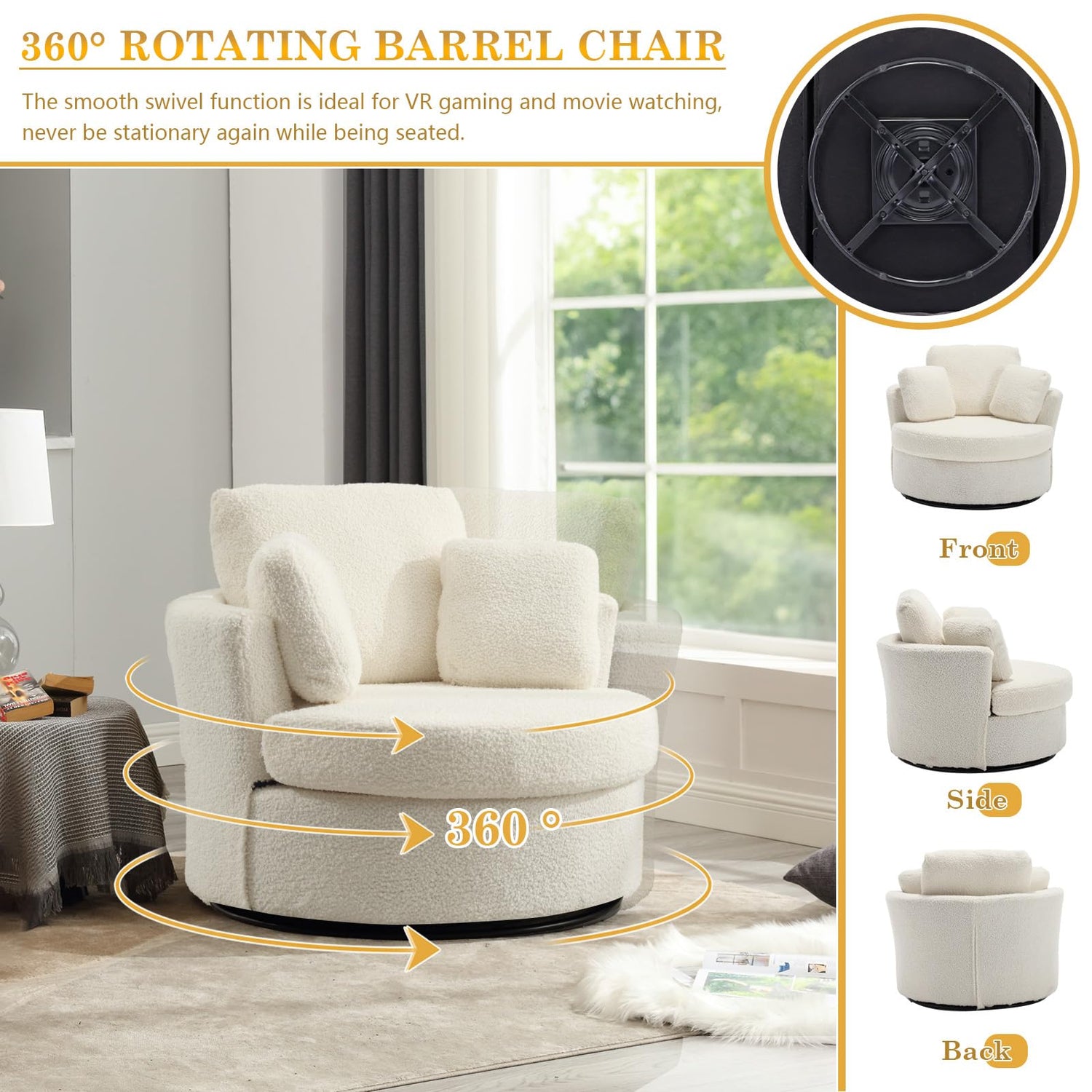 Swivel Barrel Chair, Modern Fabric Oversized 360 Degree Club Accent Arm Chairs, Single Round Living Room Sofa Chair w/ 3 Pillows for Nursery, Bedroom, Reading, Office, Ivory