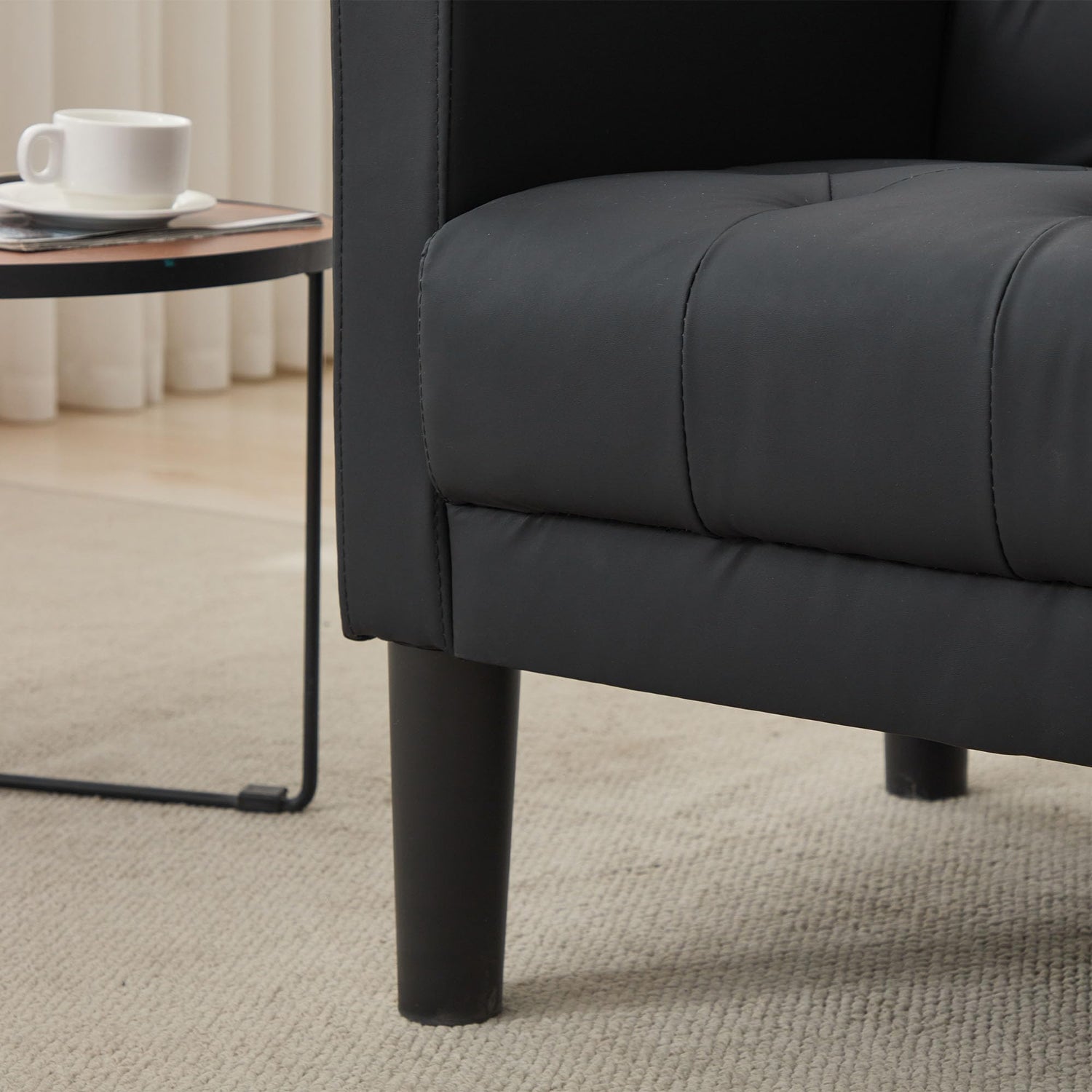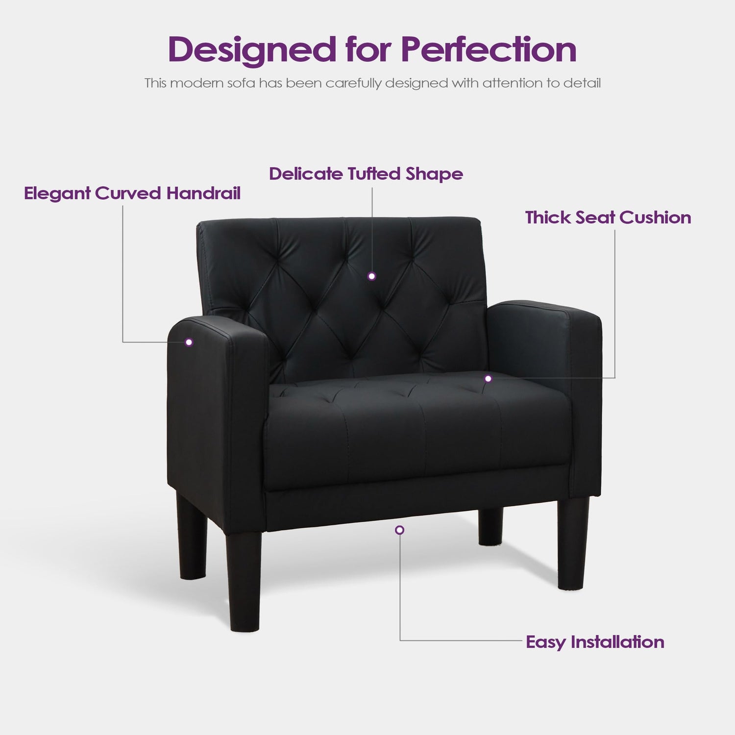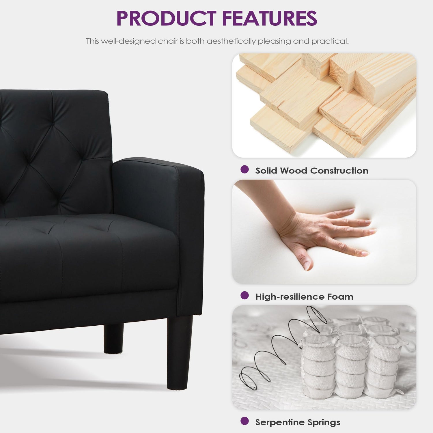 • 【DURABLE & STURDY】Durable solid wood frame, stable and thick sofa legs, this reading chair's structure is a testament to enduring stability. The black powder-coated tapered legs provide a modern twist, ensuring they remain pristine without chipping or cracking like wood legs. hold up to 300-350 pounds, this cozy chair is a beacon of strength and reliability