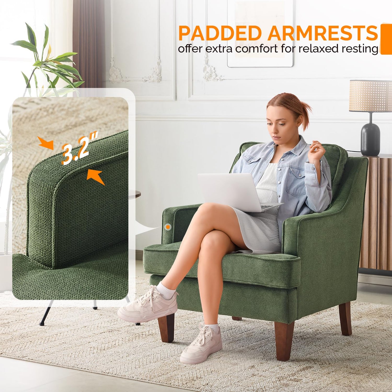 • Comfortable and Supportive-- Designed with a cushioned seat and supportive backrest, the chair provides excellent comfort for long hours of sitting, whether you're reading, lounging, or entertaining guests.