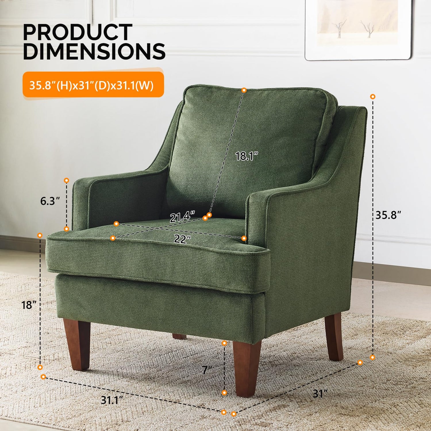 • Stylish Mid-Century Design-- With its curved arms and wooden legs, this high-back accent chair exudes mid-century modern charm. The green fabric paired with the natural wood frame creates a beautiful, complementary look that effortlessly suits any home décor style