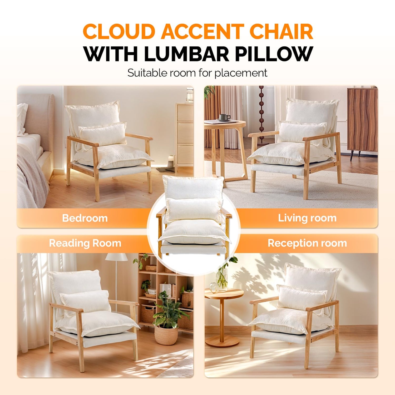 VINGLI Mid-Century Modern Cloud Accent Armchair with Lumbar Pillow, 6.3'' Thick Seat Cushion Comfortable Lounge Chair with Wooden Armrests for Bedroom, Living Room, Reading Room, Beige