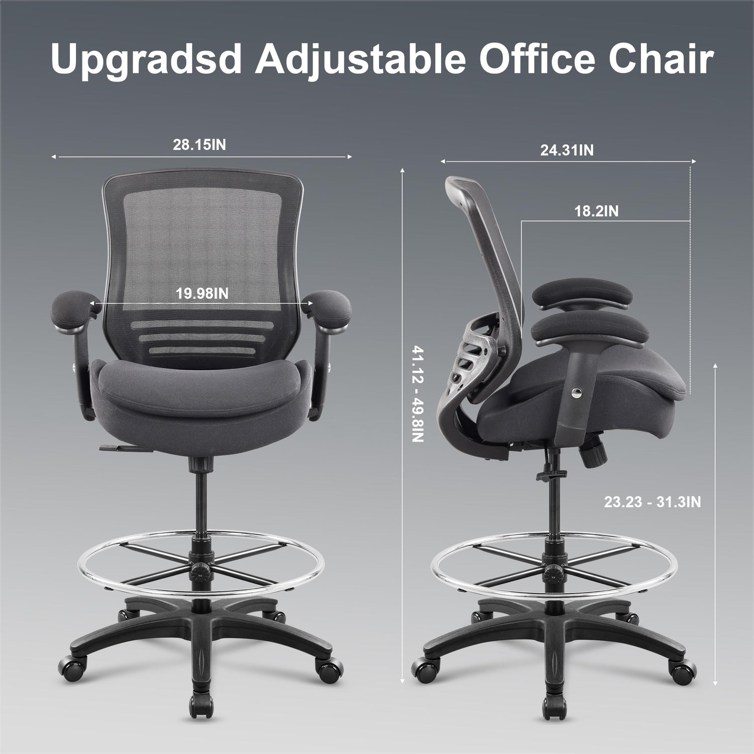 WITTLONG 400lbs Drafting Chair with Extra Seat Cushion Tall Office Chair with Soft Armrests Executive Computer Standing Desk Chair with Lumbar Support and Enlarged Adjustable Footring-Black