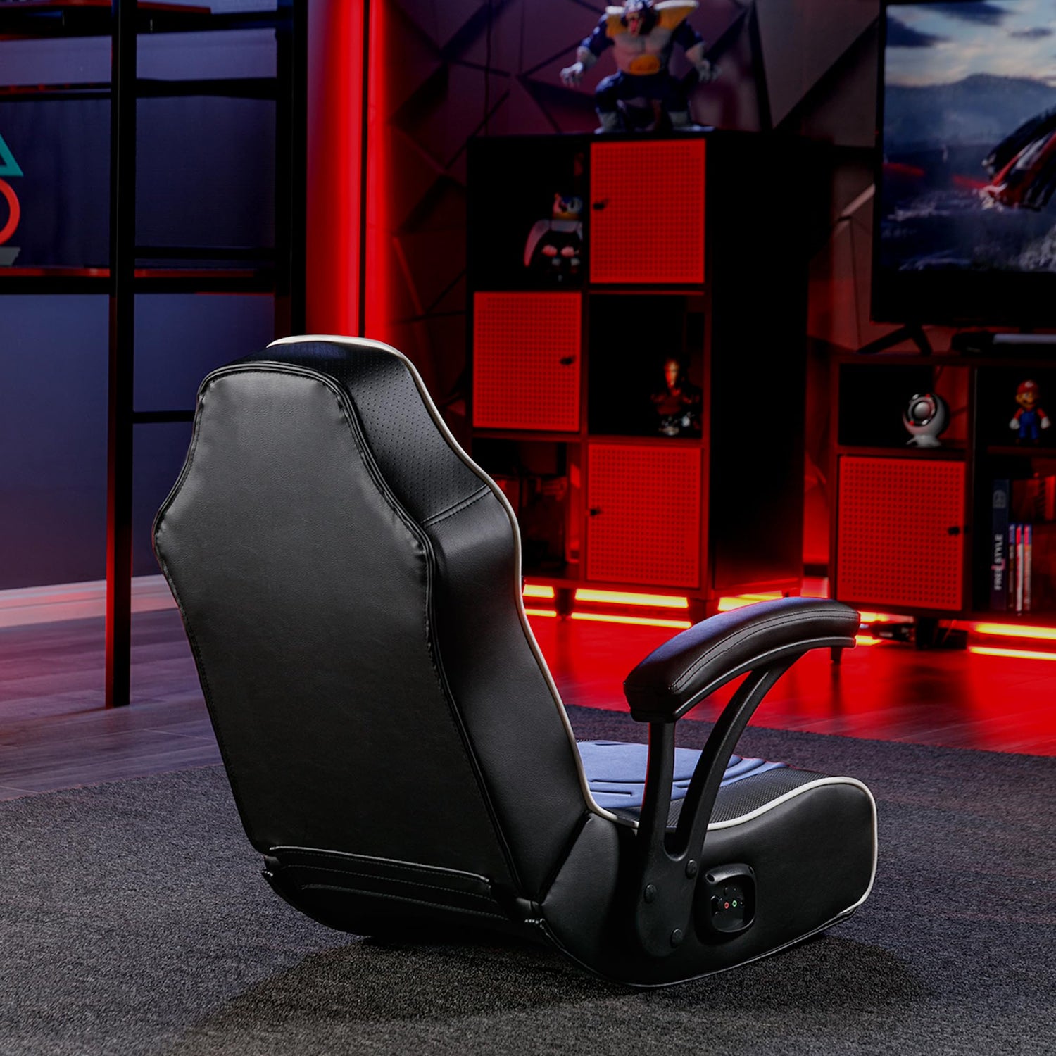 Details: Casual and professional gamers alike can now not only hear the sounds of the game but actually feel them with the X Rocker 2.0 Wired Floor Rocker. This high-tech chair features an integrated 2.0 Wired Audio System with headrest-mounted speakers and a backrest subwoofer to make you feel like you're actually inside the game. Compatible with all your favorite gaming consoles such as PS5, Xbox Series X/S, and Nintendo Switch through the 3.5mm port on the controller. The chair's surface features RGB LED technology and lights up with over 30+ color and pattern combinations that can be controlled with the touch of a button. The rocking design with armrests moves and reclines to provide comfortable playing positions throughout your longest gaming sessions. The sleek black design brings a modern look to your office, living room, game room, bedroom, or dorm room. Measuring 30.3" x 22.2" x 26.4", this chair folds down for convenient storage when not in use.