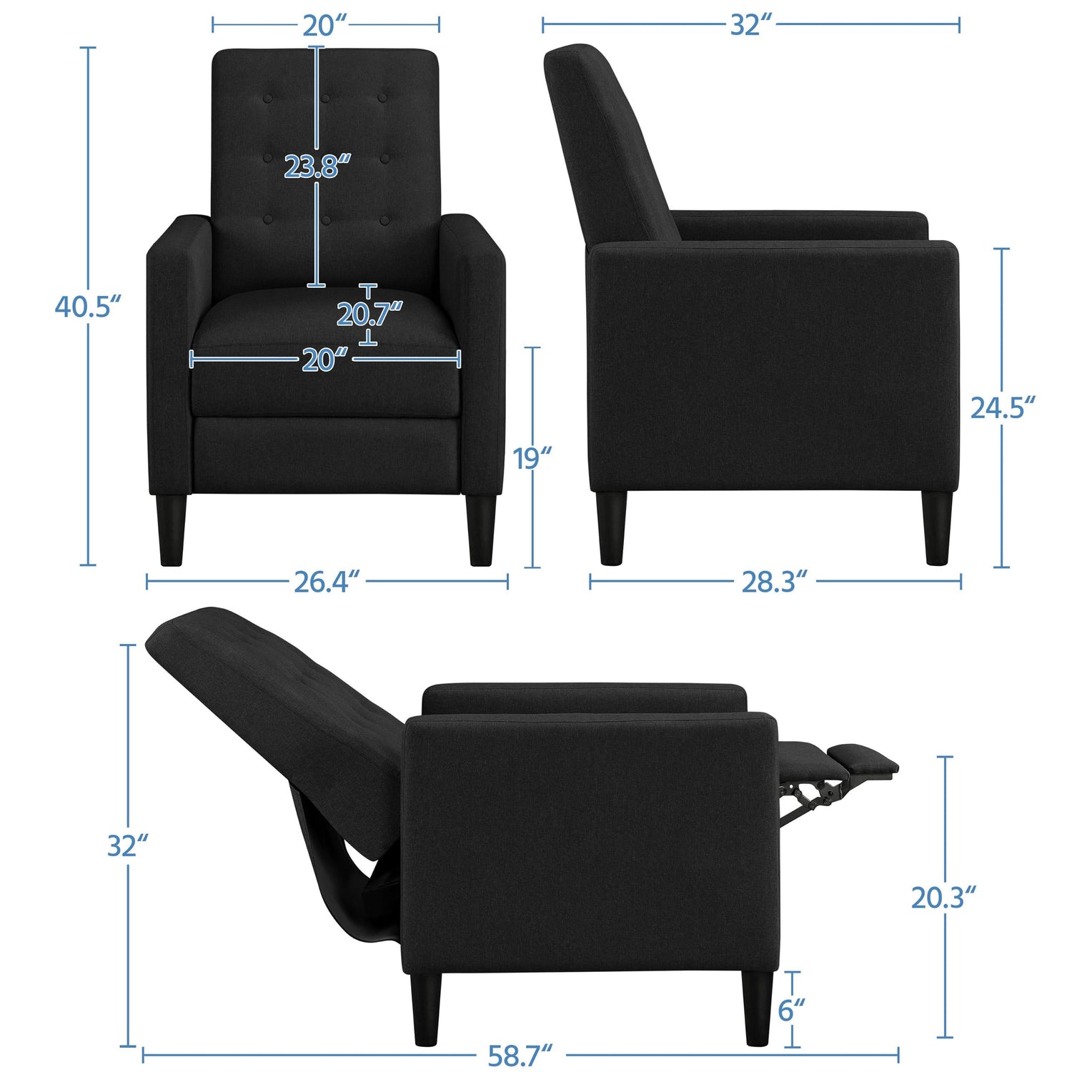 • Compact Size For Small Spaces: With an assembled size of 26.5″ W × 32″ D × 40.5″ H, this modern fabric recliner fits easily in narrow nooks and small spaces like bedrooms, game rooms, small living rooms and more.