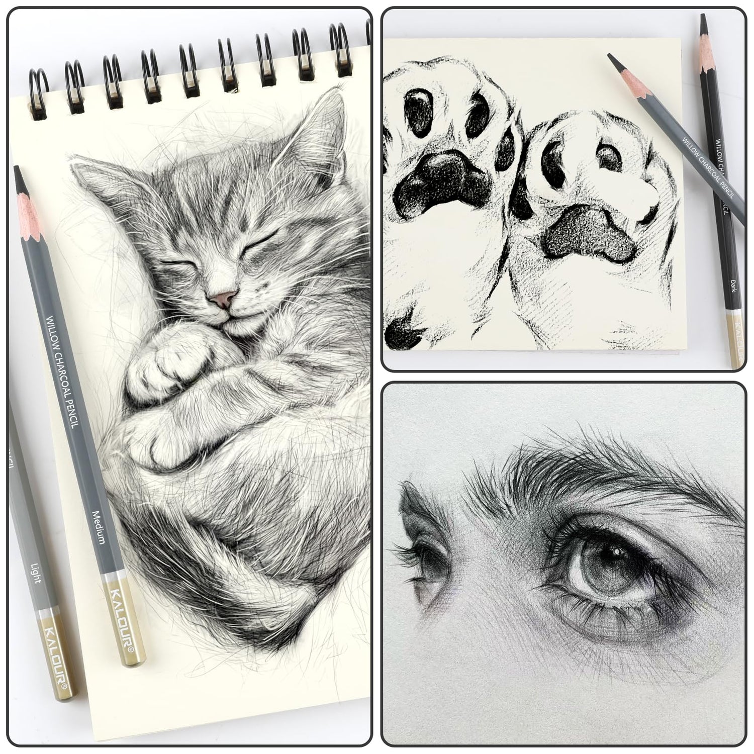 - Perfect Willow Charcoal Pencils Set: KALOUR PDAS Professional Willow Charcoal Drawing Kit includes 6 willow charcoal pencils, available in three different grades (2 Light, 2 Medium, 2 Dark). Ideal for detailing, sketching, drawing, shading, and blending.