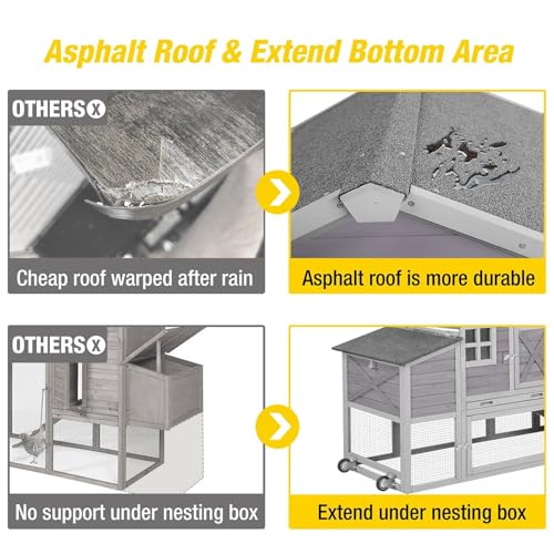 - 【Newly Upgraded Roof】The outdoor chicken house is fully covered with waterproof asphalt roof and eco-friendly paint. Double waterproof and weather resistant. UV-Resistant Roof Panel for better UV blocking. Nesting box and coop connection is equipped with PVC sealing strip to protect the coop in all aspects.
