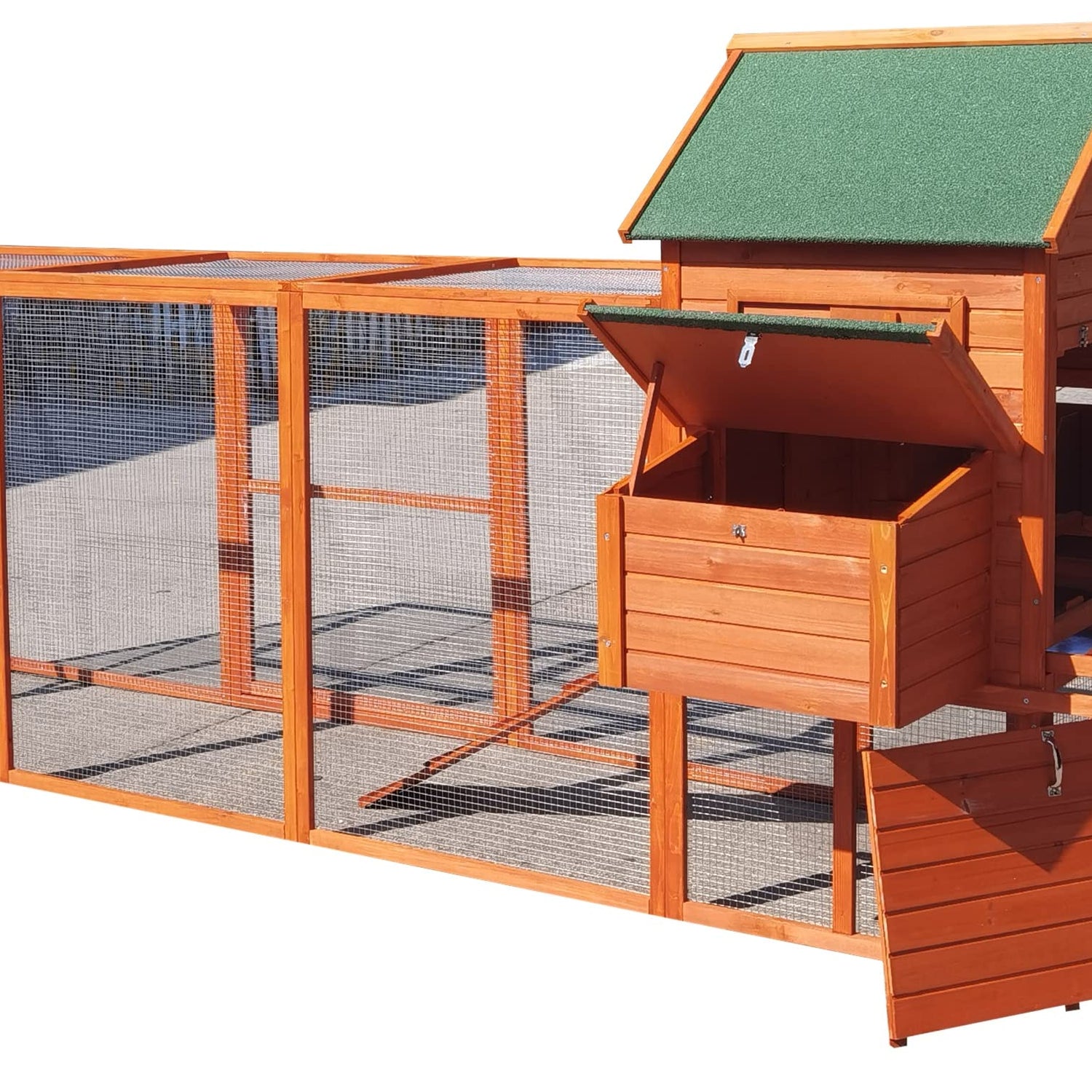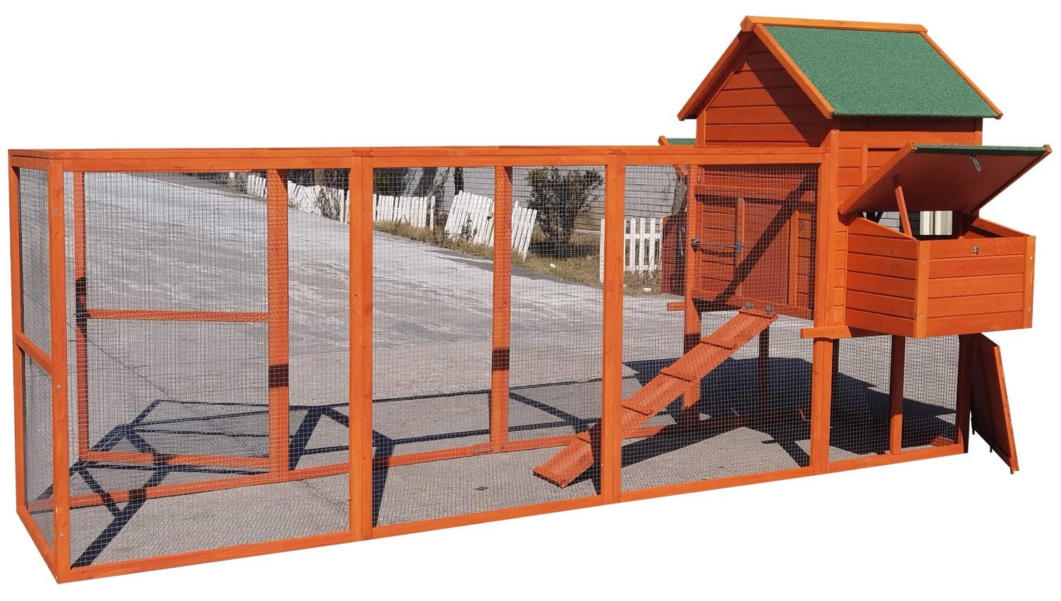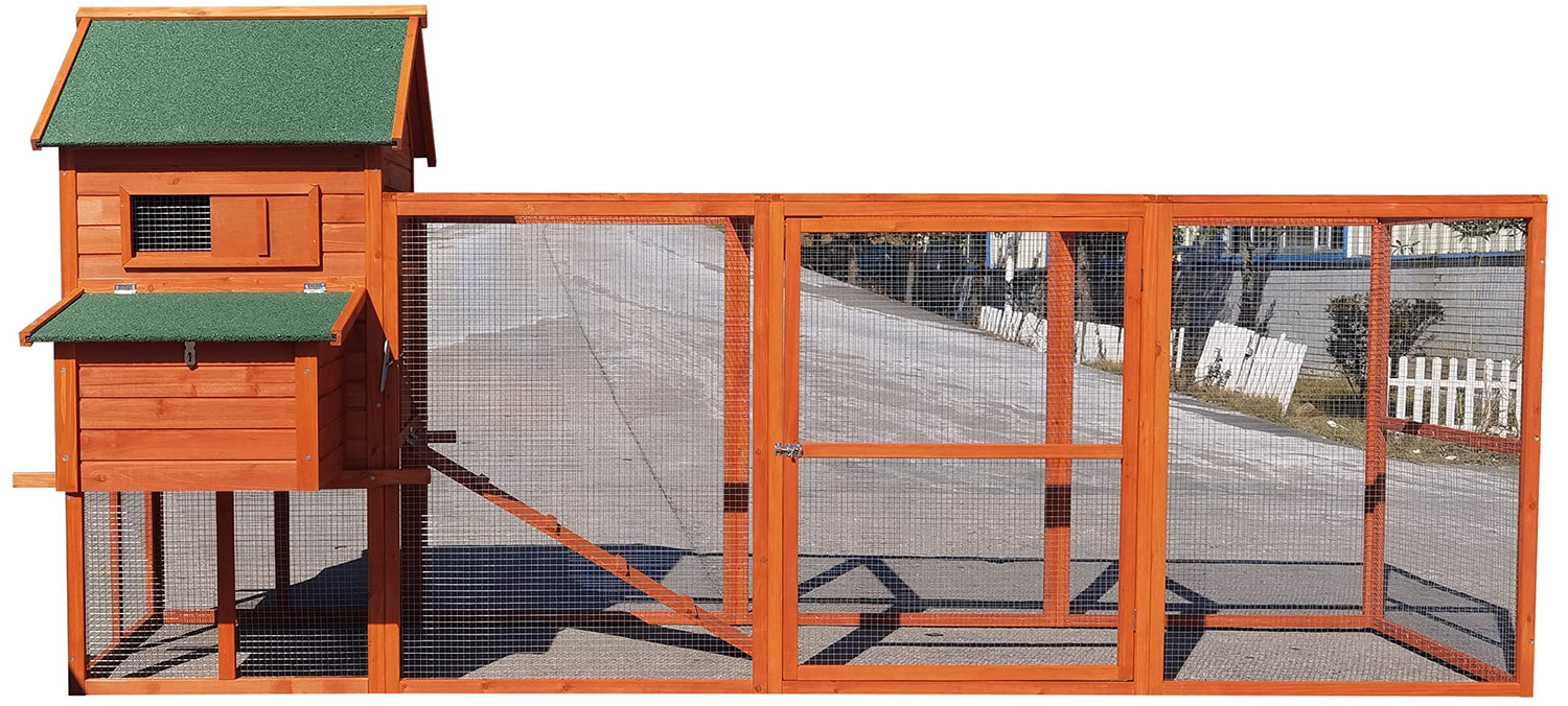 Details: All timber are T&G plained to avoid splintering. This house is designed with a living room for sleeping, and a pen downstairs. All joints are mortise and tenon. 2 x access doors on both levels. The Spray wire is solid and Non-toxic in case your animals like to chew. Dimensions: Overall: 122"(L) x 59"(W) x 59"(H) Main Features: Material: Fir construction, Solid wood Portable, lightweight, durable with good Ventilation Water proofing treatment. 100% safe for small animals 2 x Large access door 4x nesting boxes 2x roosting bars Easy cleaning tray Power Coated Wire Built-in and ramp cover connected between floors with stair lock Based on the ground directly, enough space for pets to run Heavy Duty Metal Bolts Pre-Drilled holes for quick easy assembly Installation instruction will be provided. Assemble in a few easy step with a screw driver! You DON'T need to be professional to build it! What's in the Box: 1 set of Wood house with living house & internal nesting boxes & run