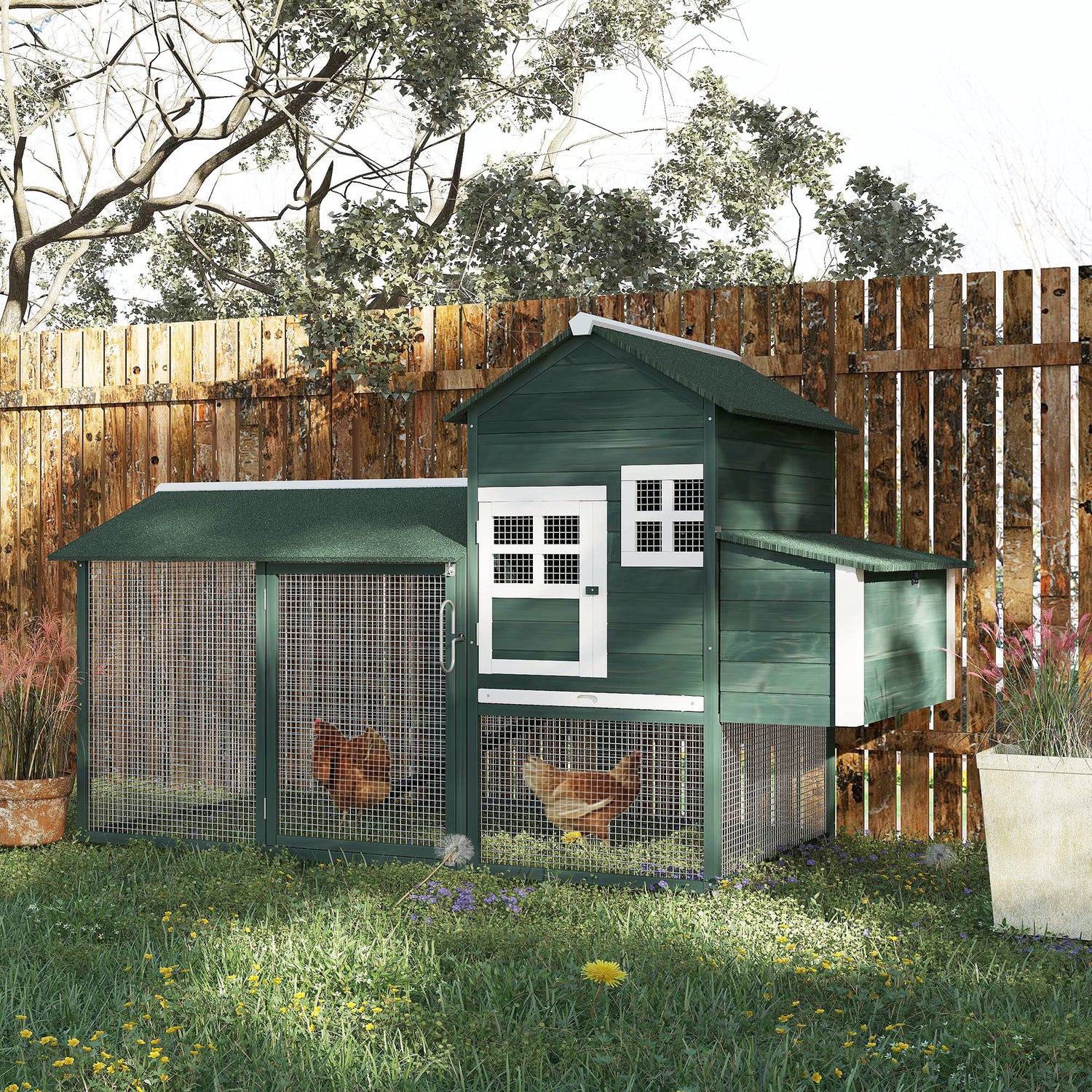 PawHut 84" Wooden Chicken Coop, Hen House Outdoor with Run Nesting Box, Asphalt Roof, Removable Tray, Ramp, Poultry Cage for 2-3 Chickens, Green