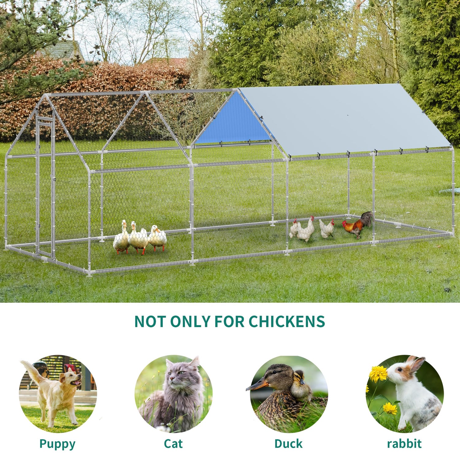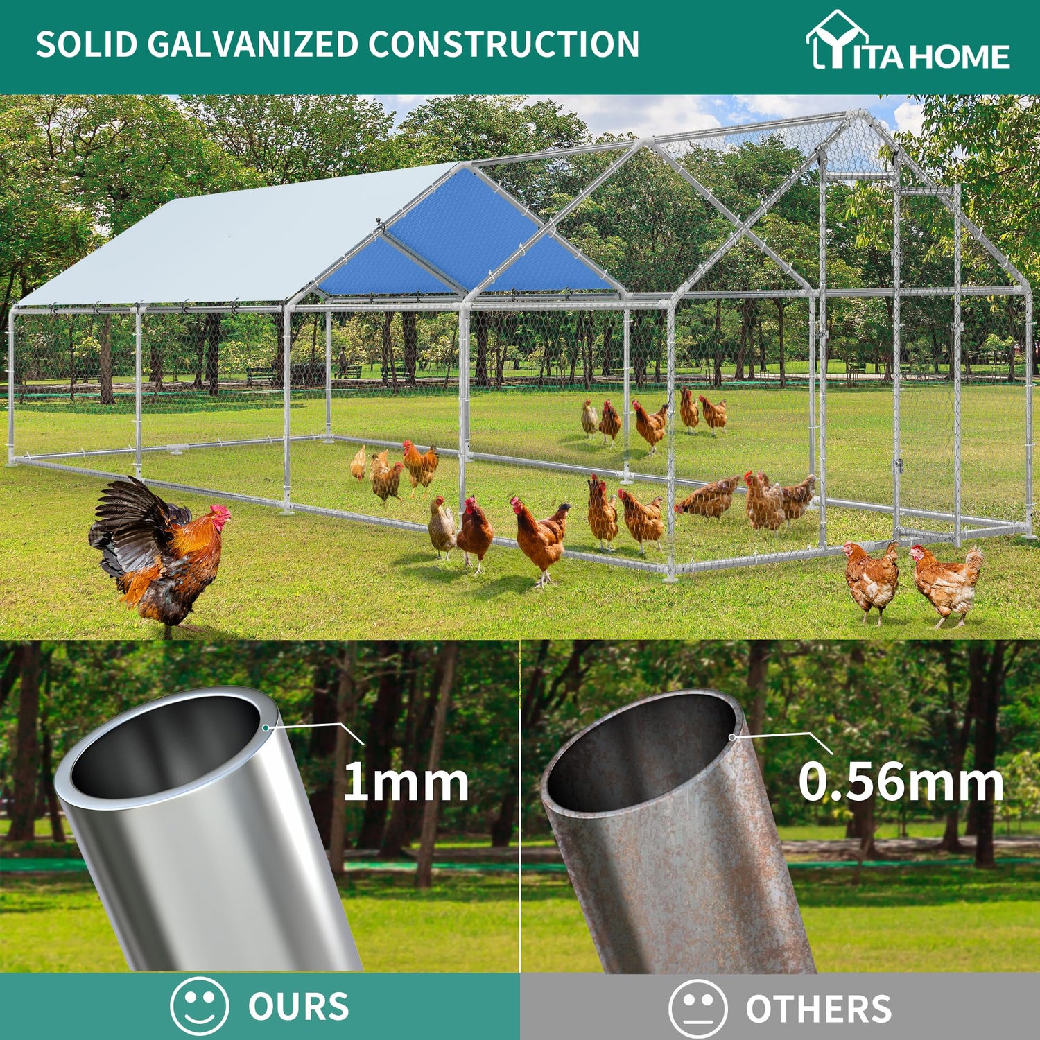 Details: YITAHOME Outdoor Metal Chicken Coop is crafted from high-quality galvanized thick steel tubes to ensure excellent stability. The spiked top design prevents heavy pressure caused by rain and snow. With dimensions of 26.24'L x 9.84'W x 6.39'H, this coop offers ample space for chicks to move freely. Equipped with waterproof and UV-resistant top cloth, the coop shields the chickens from harsh weather conditions. The package includes a large coop and a detailed instruction manual, making installation a time-saving process.