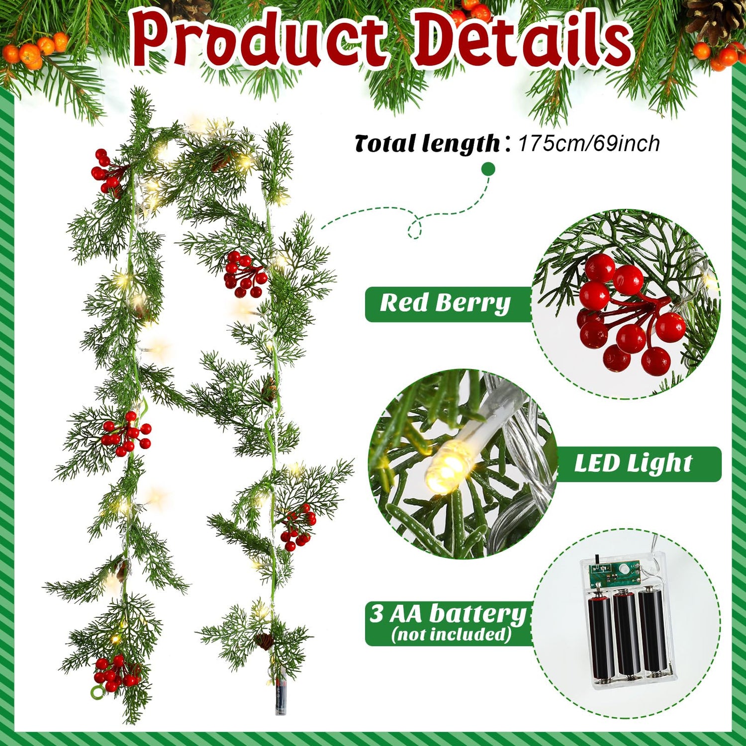 • Full of Christmas Atmosphere: this Christmas garland is designed with pine needles, pine cones and red berries, vivid and classic, adding a strong atmosphere feeling; Equipped with soft warm white 20 LED string, this wreath can create a warm and happy atmosphere, measuring about 5.74 feet long, enough to meet your various decorative needs, suitable for many places in your home