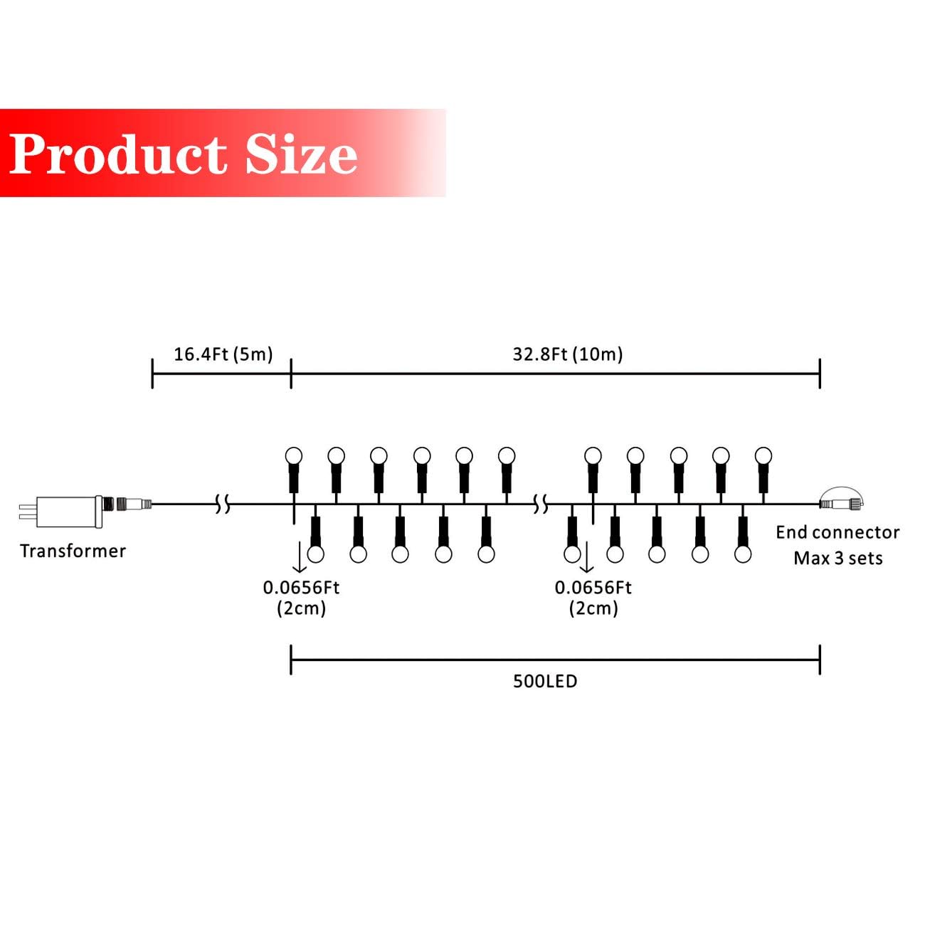 - High Quality: 500 LED 49ft Christmas cluster lights with solid construction plastic material, adapter powered. 29V low voltage string lights with UL 588 certified for safety use. Length between lights : 0.8 Inches, power line: 16.4ft. light string: 32.8ft, length totally: 49ft approx.