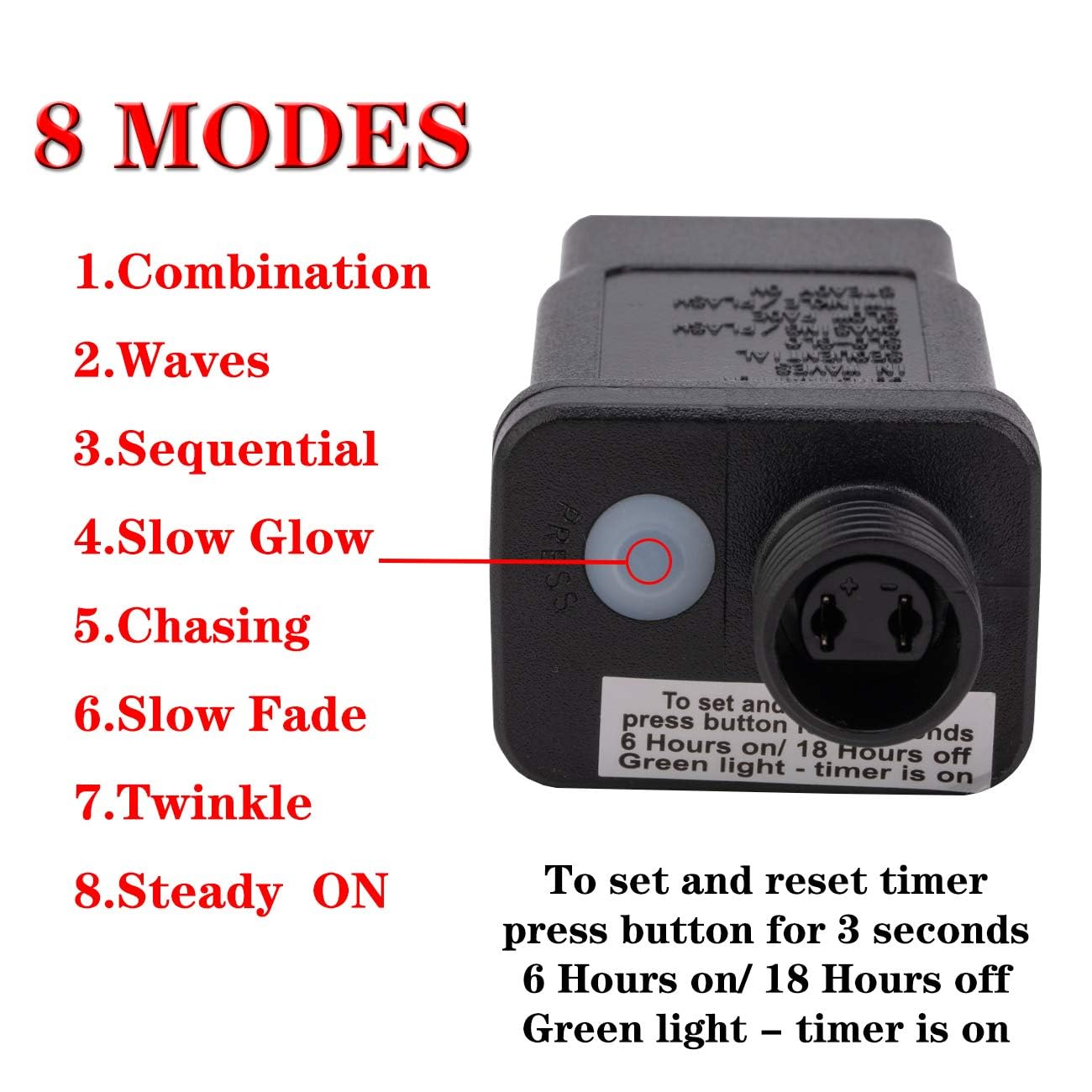 - 8 Modes and Timer Function: 8 Functions to fit different occasions, moods, feelings, holidays, festivals, anniversaries, etc. Satisfied different requirement. (Combination, In waves, Sequential, Slow Glow, Chasing/Flash, Slow fade, Twinkle/Flash, Steady on). Just press the button on the power adaptor to change shining modes. Set timer to keep the lights on for 6 hours every day. To cancel the timer, simply press button on the power adaptor or just plug off the lights.