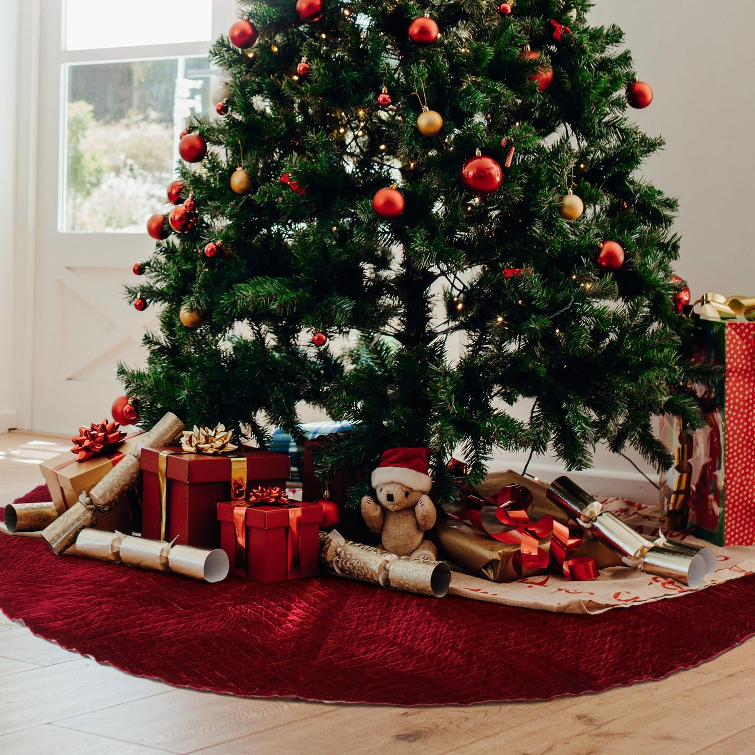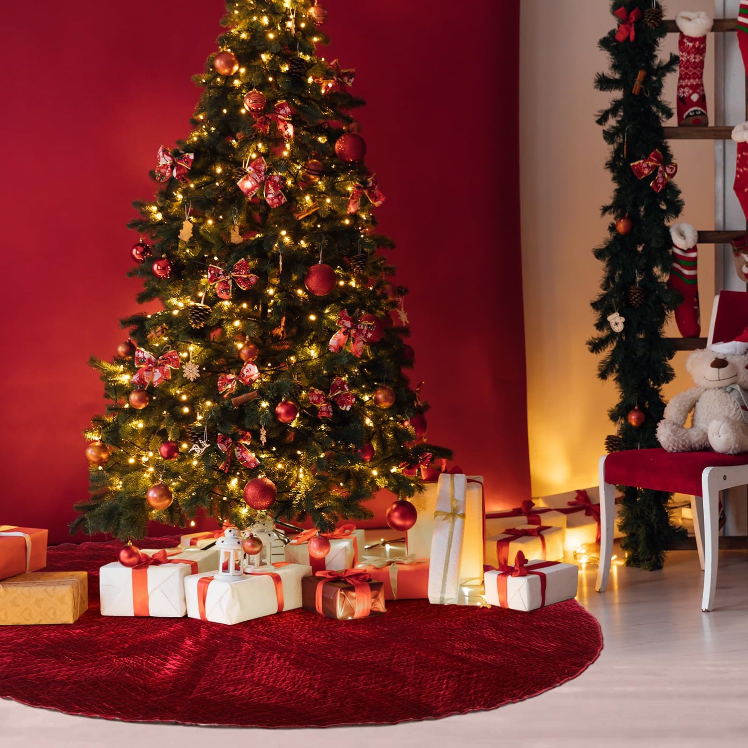 - Quality Christmas Tree Skirt: this is an 84 inch oversized burgundy velvet Christmas tree skirt with quilting, in line with the Christmas atmosphere; Elevate the look of your Christmas tree with a burgundy velvet Christmas tree skirt